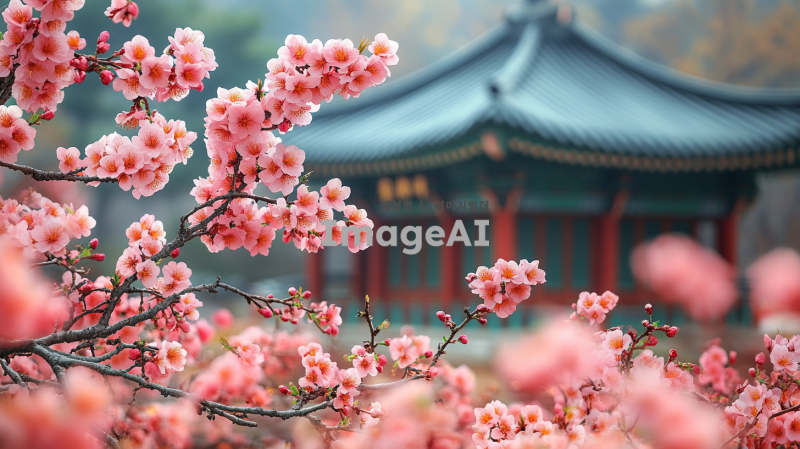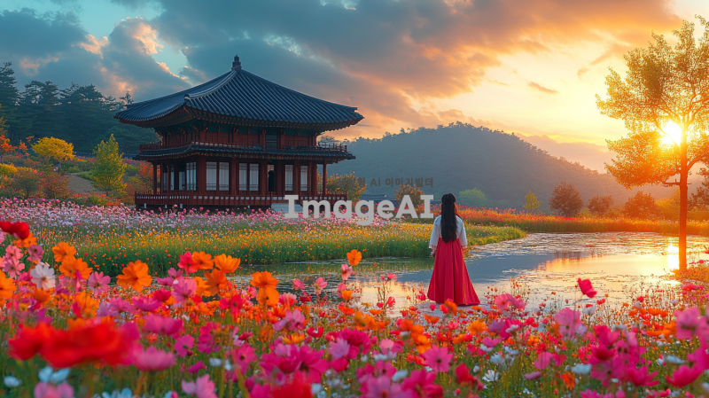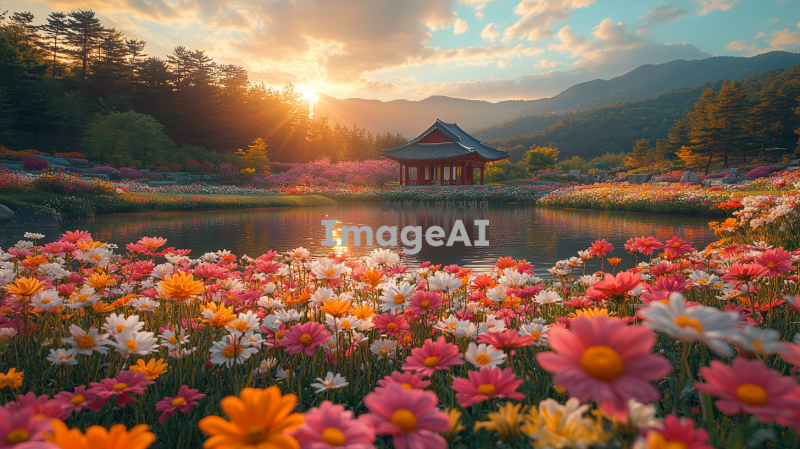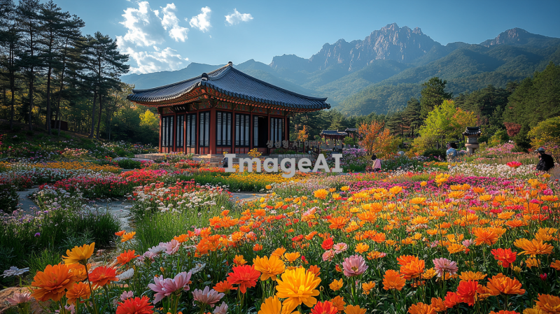 봄꽃이 만개한 아름다운 풍경, 다양한 색상의 꽃들이 화사하게 피어있는 모습, 푸른 하늘과 따스한 햇살 아래에서 꽃들이 바람에 살랑거리는 장면, 한국의 전통 정원이나 공원 배경, 평화롭고 생동감 넘치는 분위기.