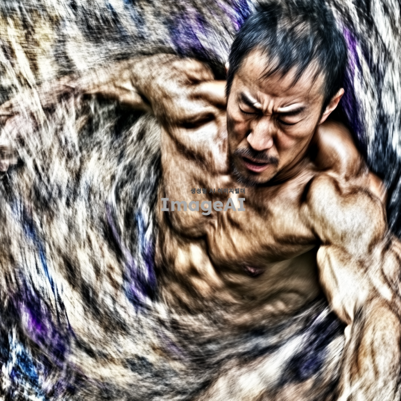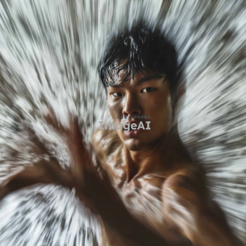 노력하는 모습을 추상적으로 표현한 이미지, 한국인 남성이 운동하는 모습, 힘든 표정, 땀방울이 흐르는 모습, 역동적인 자세, 배경은 흐릿하게 처리하여 집중할 수 있도록, 색상은 따뜻한 톤으로 조화롭게 구성, 에너지가 넘치는 느낌을 주는 형태로.