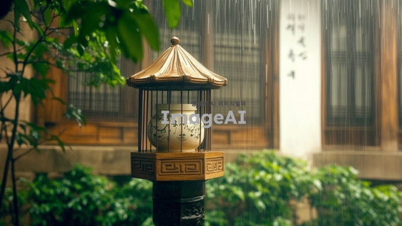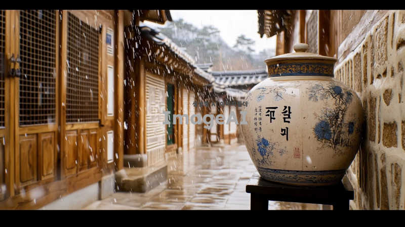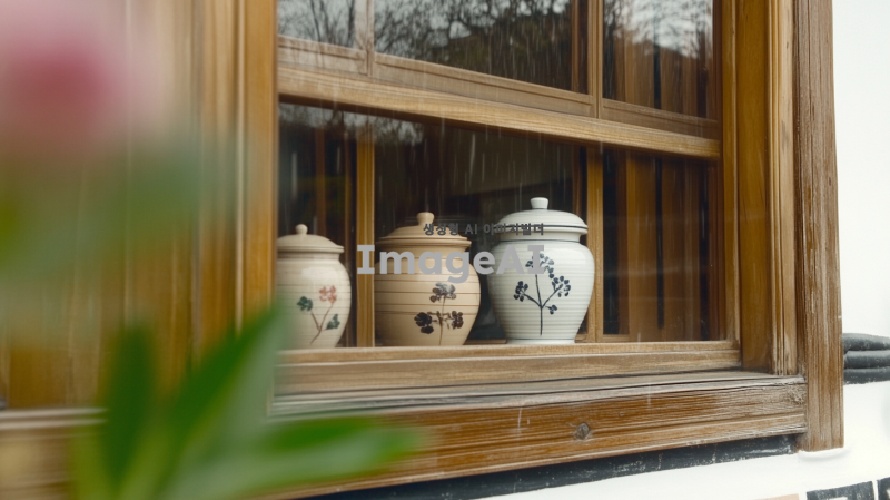 고즈넉한 한옥의 마당이 보이고 장독대가 자리 잡고 있는 모습, 창문 너머로 비가 내리고 있는 장면, 고요하고 평화로운 분위기, 자연광이 부드럽게 비치는, 한국의 전통적인 요소가 강조된 풍경