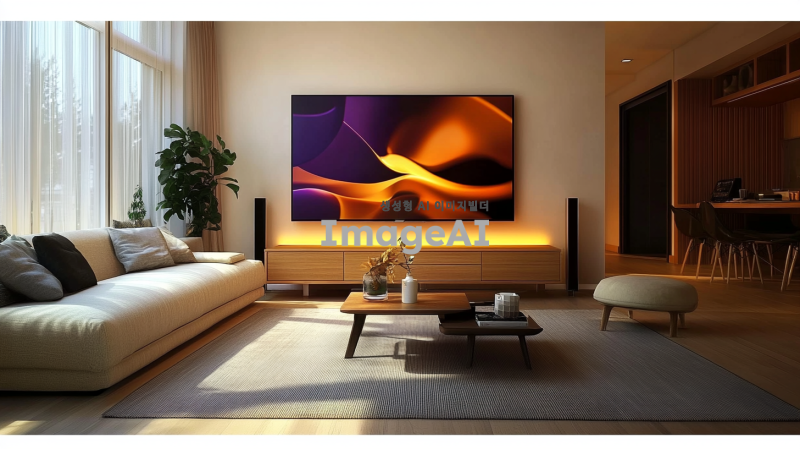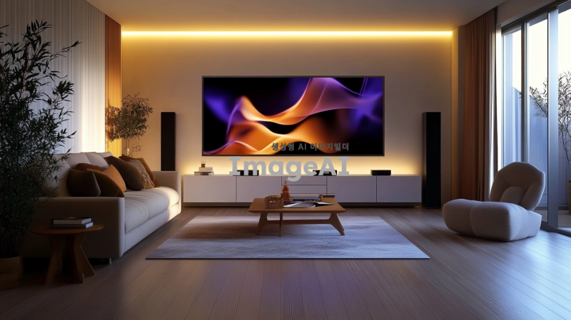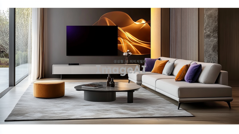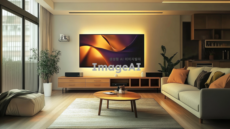 모던한 한국 스타일의 거실, 조명 아래 편안한 소파와 커피 테이블, 벽쪽에는 TV를 놓을 수 있는 서랍이나 장소가 있지만 TV는 없는, 창문을 통해 자연광이 들어오는 모습, 전체적으로 세련되고 아늑한 분위기.