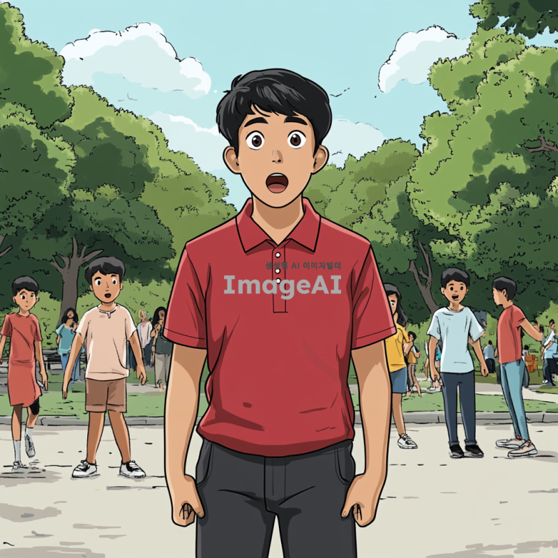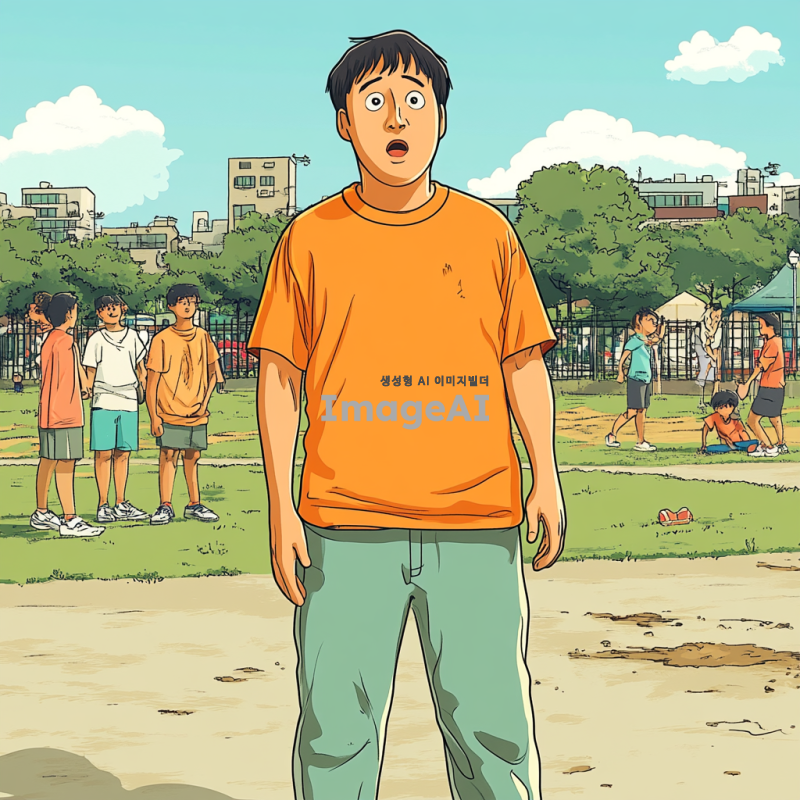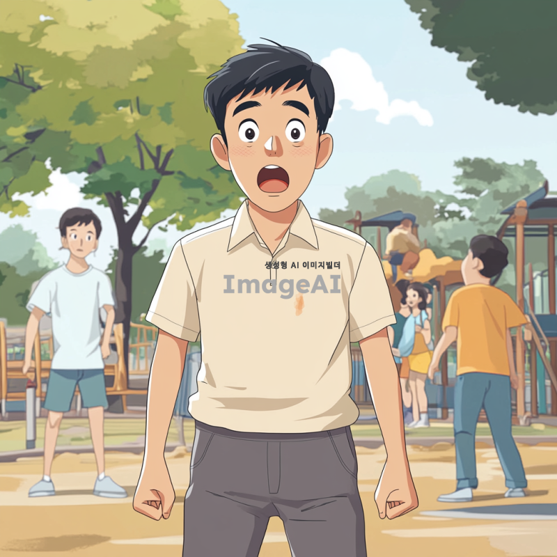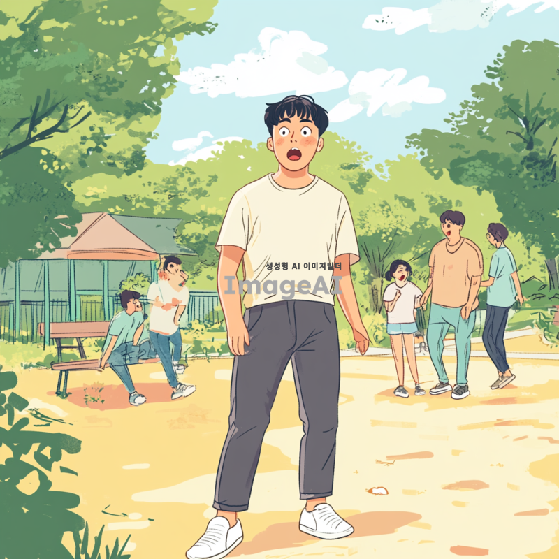 한국의 한 남성이 놀란 표정으로 서 있는 모습, 그의 바지에 작은 얼룩이 있는 상황, 배경은 공원에서 친구들과 함께 놀고 있는 장면, 만화 스타일로 생동감 있게 표현해 주세요.