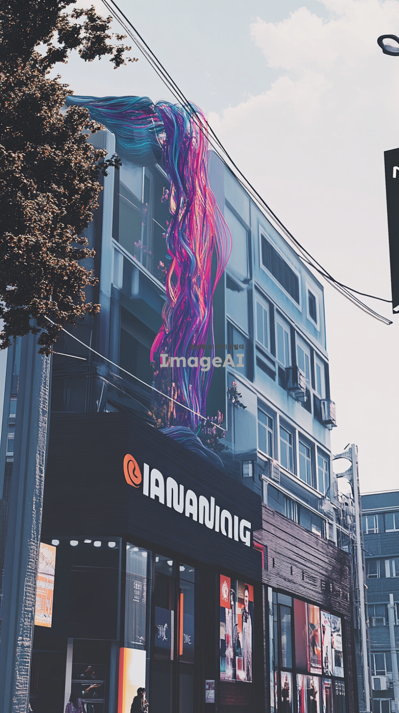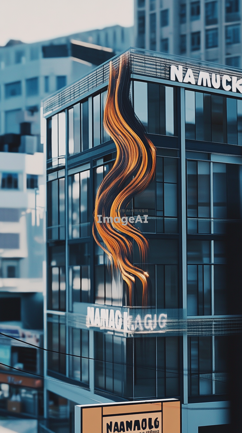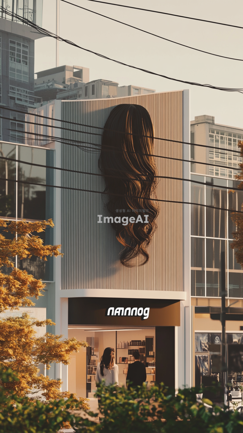 도시 속 세련된 미용실 건물 옥상에서 머리카락이 자라나는 장면을 3D 스타일로 표현. 머리카락은 생명력이 넘치게 건물 아래를 향해 감싸듯이 자라고 있으며, 부드럽고 자연스럽게 휘어지는 실루엣을 가짐. 빛이 반사되어 머리카락이 윤기 있고 건강한 느낌을 주며, 미용실 건물에는 'NaNalog' 로고가 보이도록 디자인. 주변은 현대적인 도시 풍경이며, 전체적인 분위기는 미래적이고 혁신적인 느낌