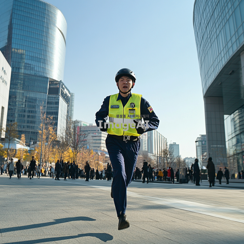 한국의 도시 거리에서 뛰고 있는 경비원, 밝은 유니폼을 입고 헬멧을 쓴 모습, 빠른 속도로 달리며 주변을 경계하는 표정, 배경에는 현대적인 건물과 사람들, 생동감 넘치는 분위기, 낮의 맑은 하늘 아래에서의 장면.