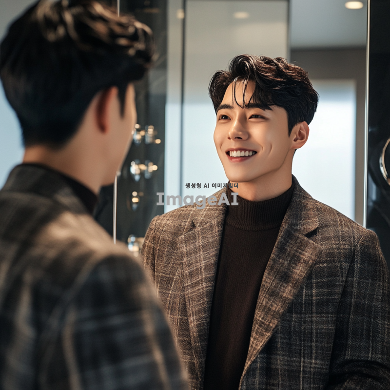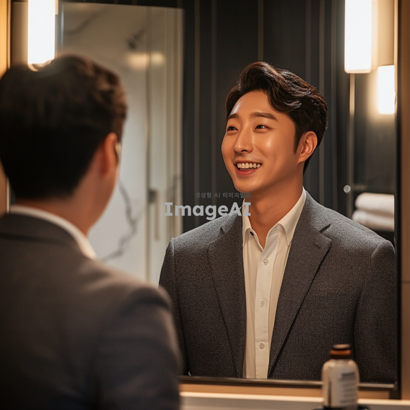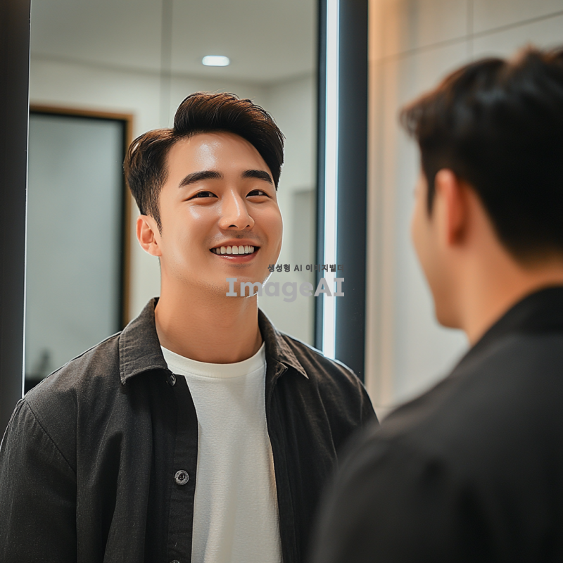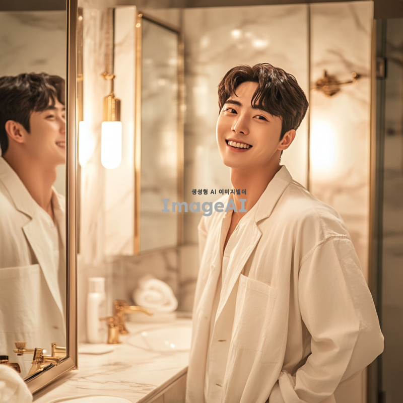 잘생긴 한국 남자가 거울 앞에서 자신을 바라보며 미소 짓고 있는 모습, 자연스러운 조명 아래에서의 사실적인 피부 표현, 세련된 스타일의 옷을 입고 있으며, 배경은 현대적인 인테리어로 꾸며진 욕실, 거울에 비친 그의 모습이 선명하게 보이는 장면.