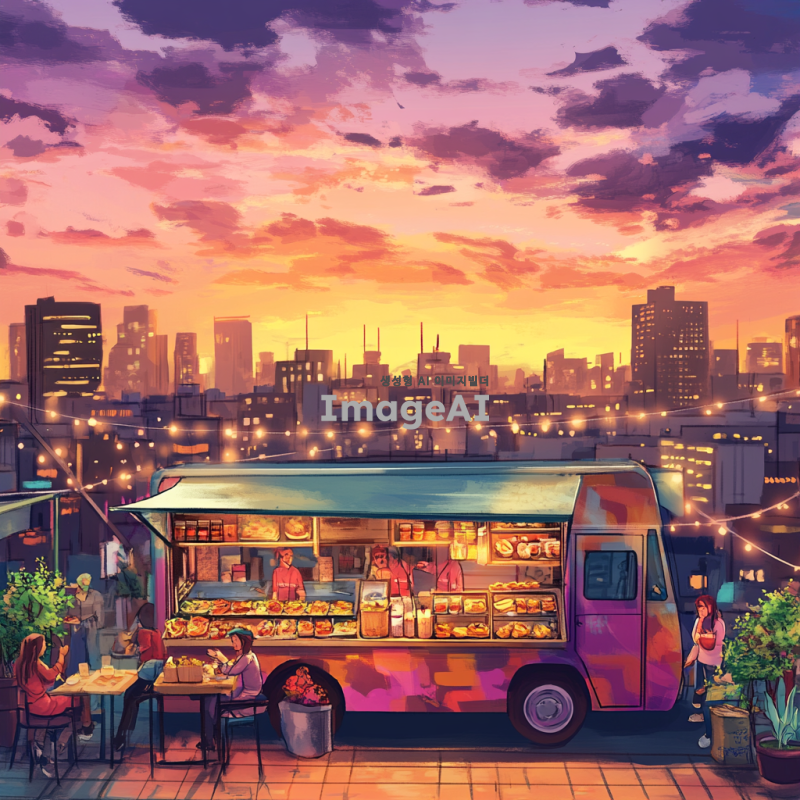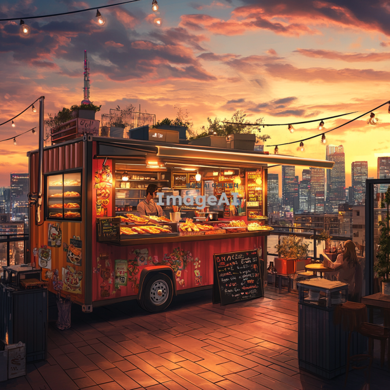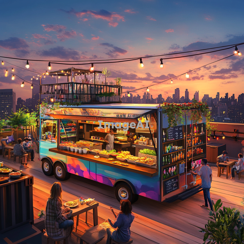 루프탑에 위치한 푸드트럭과 컨테이너의 풍경을 그려줘. 푸드트럭은 화려한 색상으로 장식되어 있으며, 다양한 음식을 판매하는 모습이 담겨 있다. 컨테이너는 현대적인 디자인으로, 주변에는 도시의 전경이 보인다. 해가 저물어가는 시간대의 따뜻한 빛이 분위기를 감싸고, 사람들이 푸드트럭 주변에서 즐거운 시간을 보내고 있는 장면을 포함해줘.
