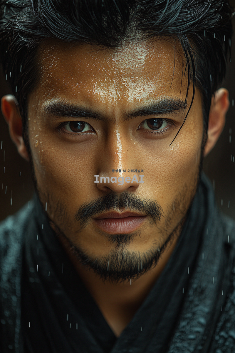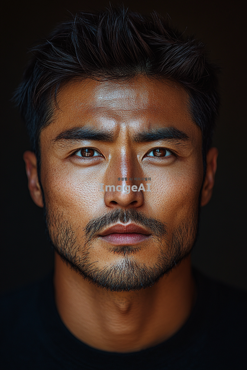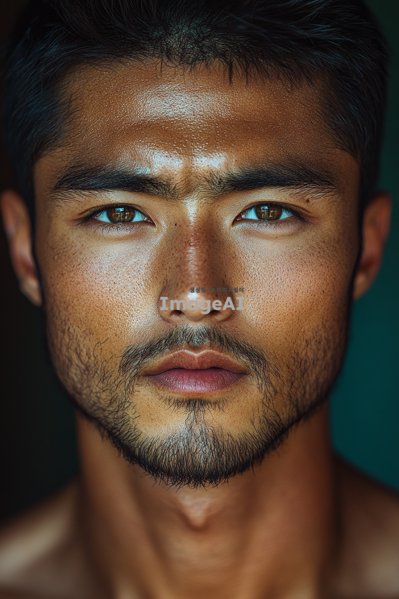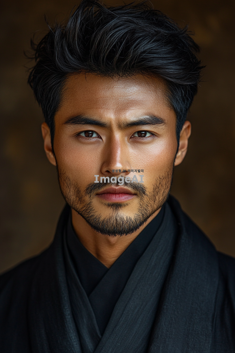 동양 미남. 눈매가 찢어진 무쌍. 짧은 머리카락과 진한 눈썹. 날렵한 턱선