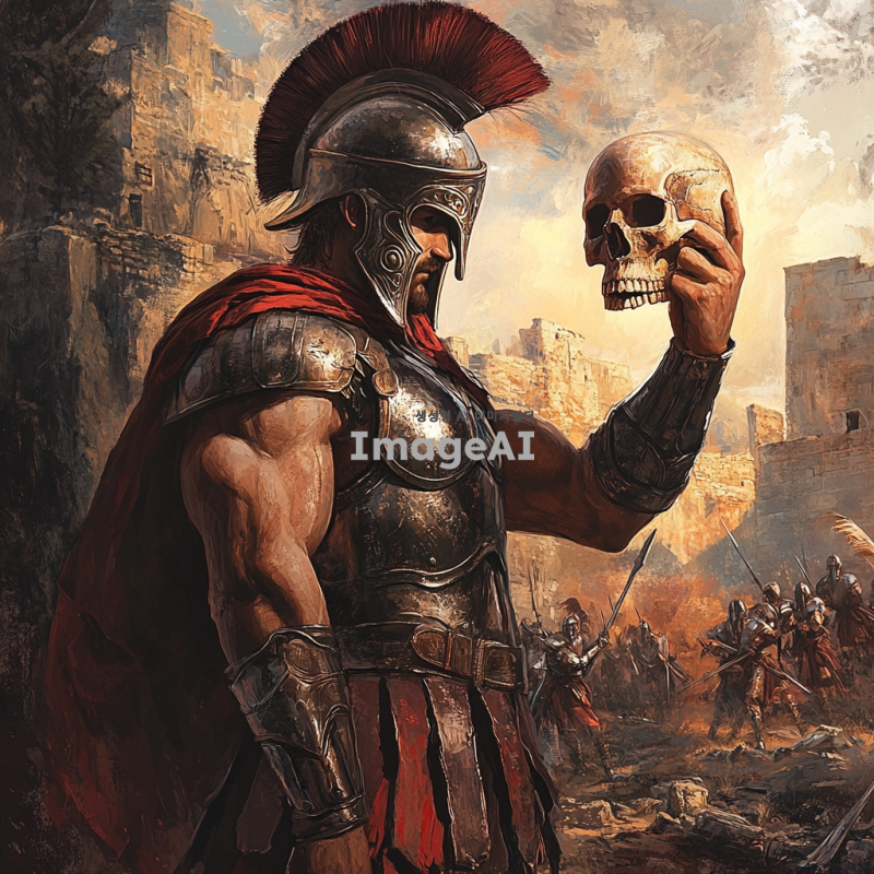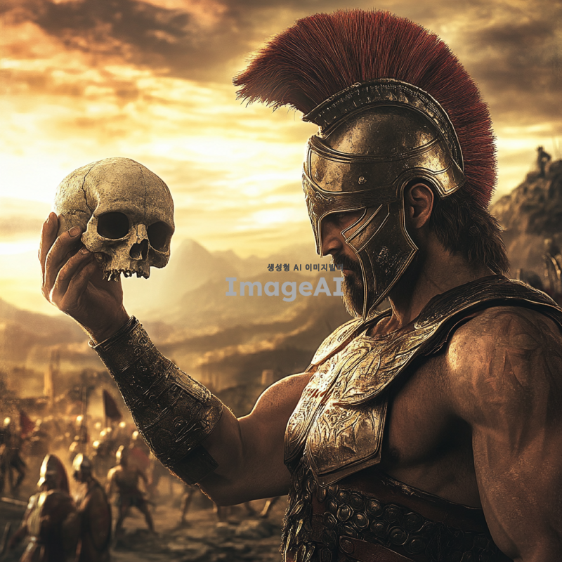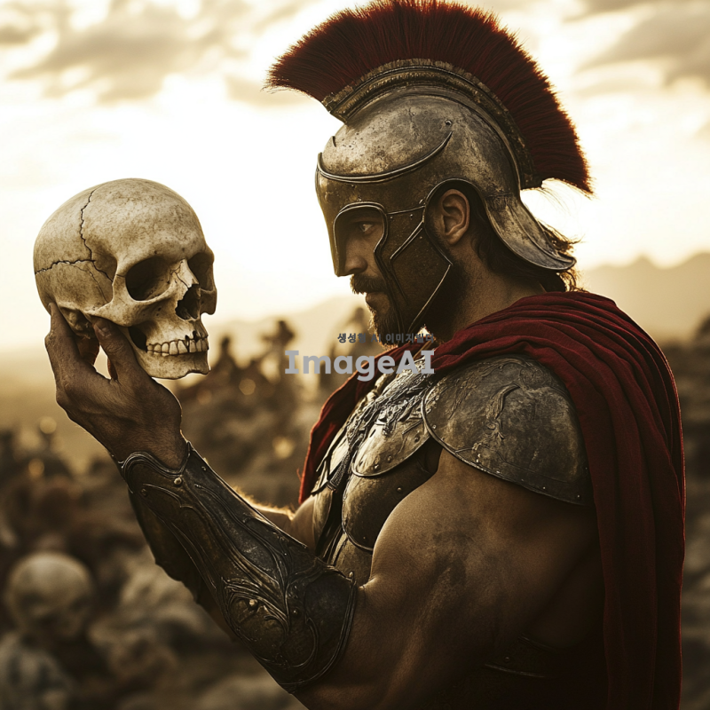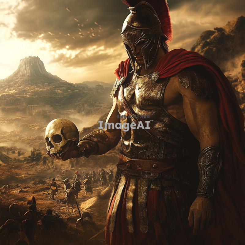 고대 스파르타 전사, 전투에서의 승리를 기념하며 유골을 들고 있는 모습. 강렬한 표정과 함께 전사 갑옷을 입고 있으며, 배경에는 고대 스파르타의 전투 장면이나 전쟁터가 펼쳐져 있다. 햇살이 비추는 가운데, 전사의 결의와 용기가 느껴지는 장면.