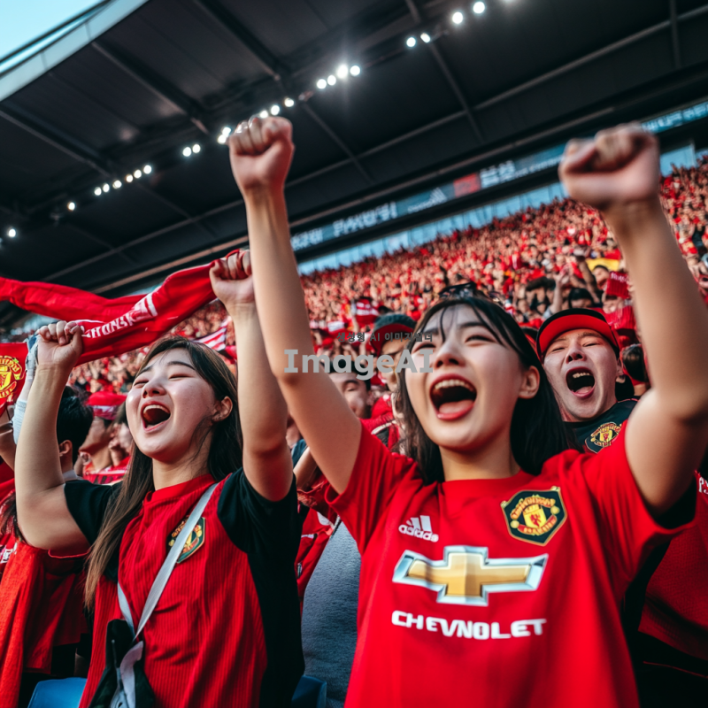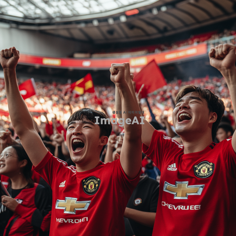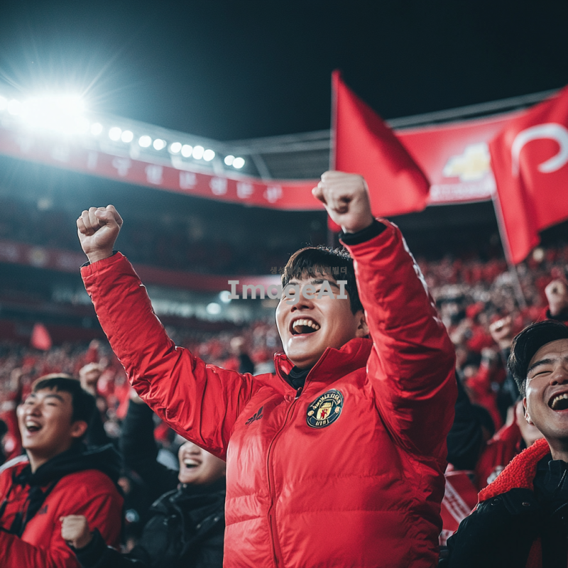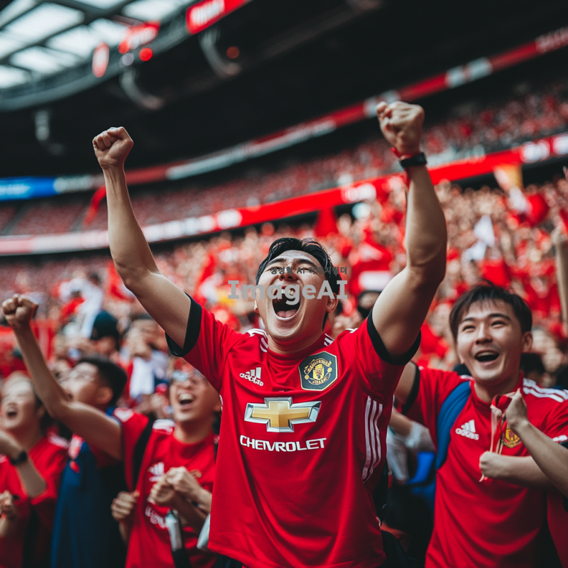 한국의 축구 팬들이 맨체스터 유나이티드의 경기를 응원하는 모습, 붉은색 유니폼을 입고 있는 사람들, 다양한 연령대의 팬들이 함께 모여 응원하는 장면, 경기장에서의 열정적인 분위기와 함께 팀 로고와 깃발이 배경에 보이는 모습, 축구의 역동성과 팬들의 열정을 강조한 이미지.
