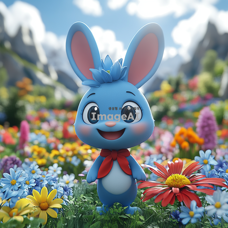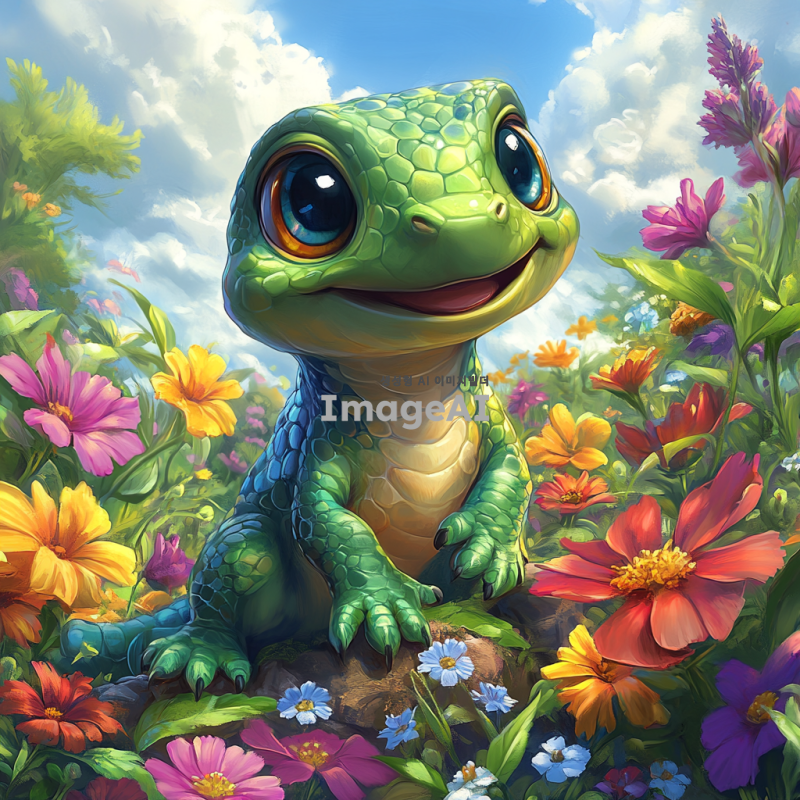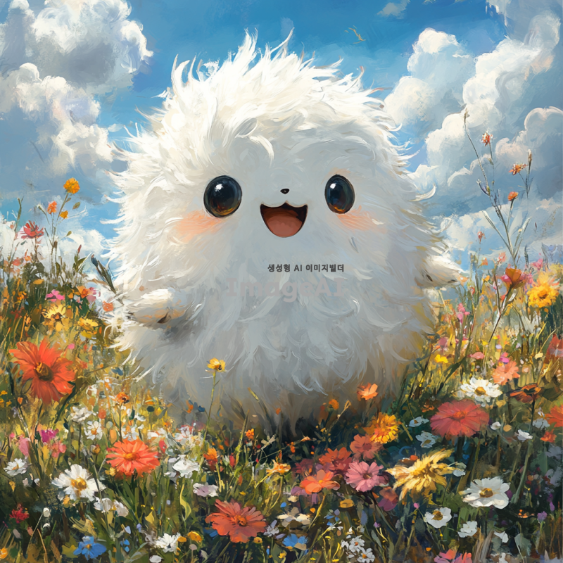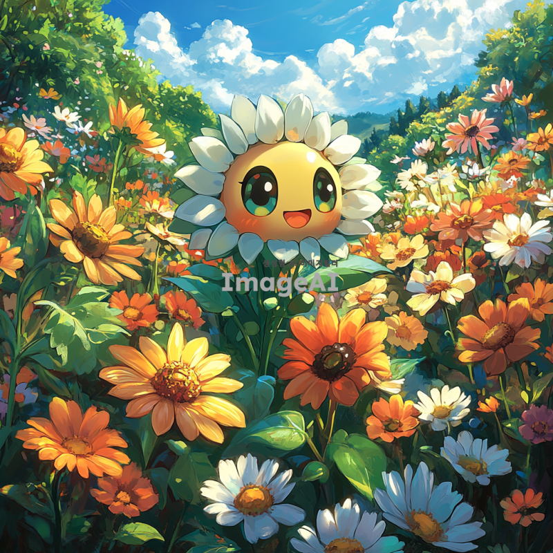 작고 귀여운 잡초 캐릭터가 화사한 정원에서 다양한 색상의 꽃들과 함께 어울려 놀고 있는 모습, 캐릭터는 큰 눈과 미소를 지으며 호기심 가득한 표정을 짓고 있으며, 주변에는 햇살이 비추고 있어 따뜻한 분위기를 연출하고 있음. 잡초 캐릭터는 부드러운 곡선과 밝은 색상으로 디자인되어 있으며, 배경에는 푸른 하늘과 흰 구름이 떠 있는 풍경.