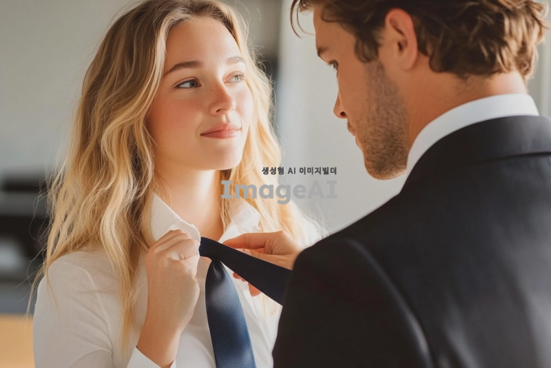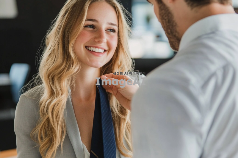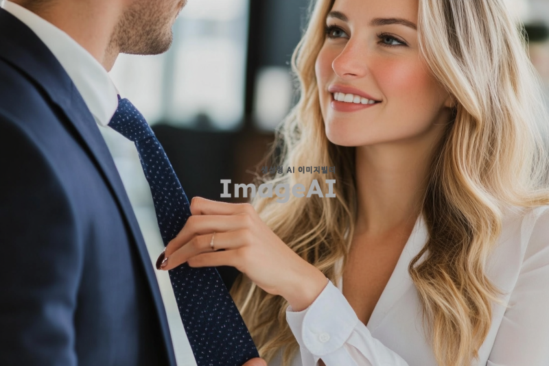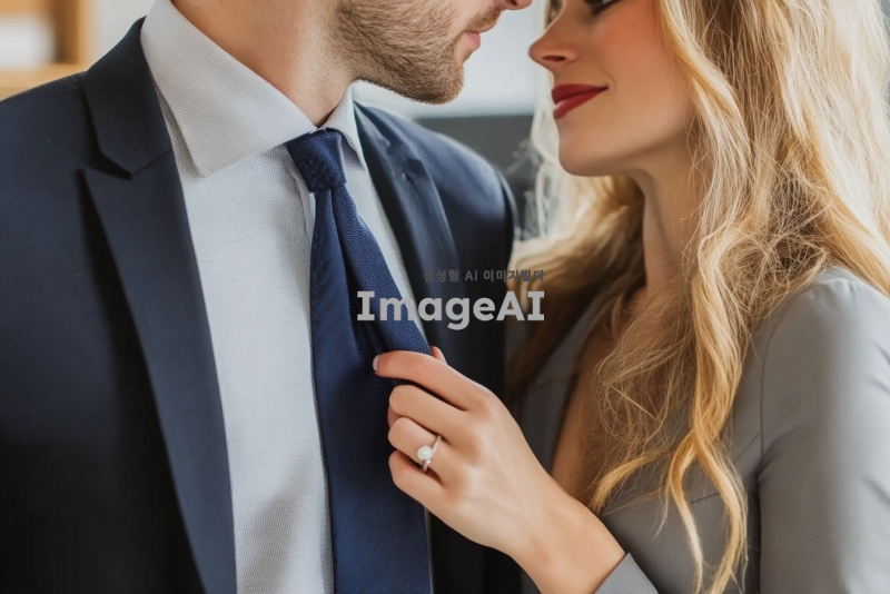 금발 웨이브머리 백인 여자가 남자의 넥타이를 끌어당기는 모습
