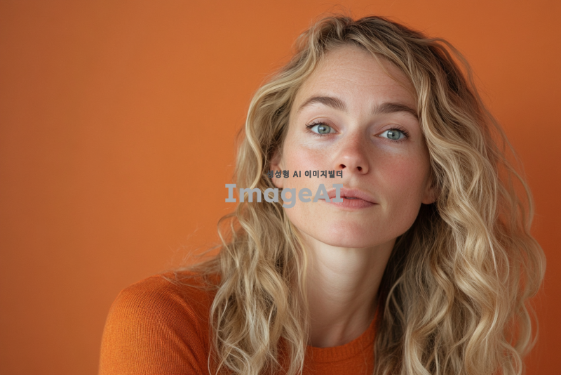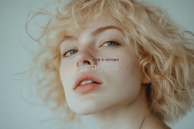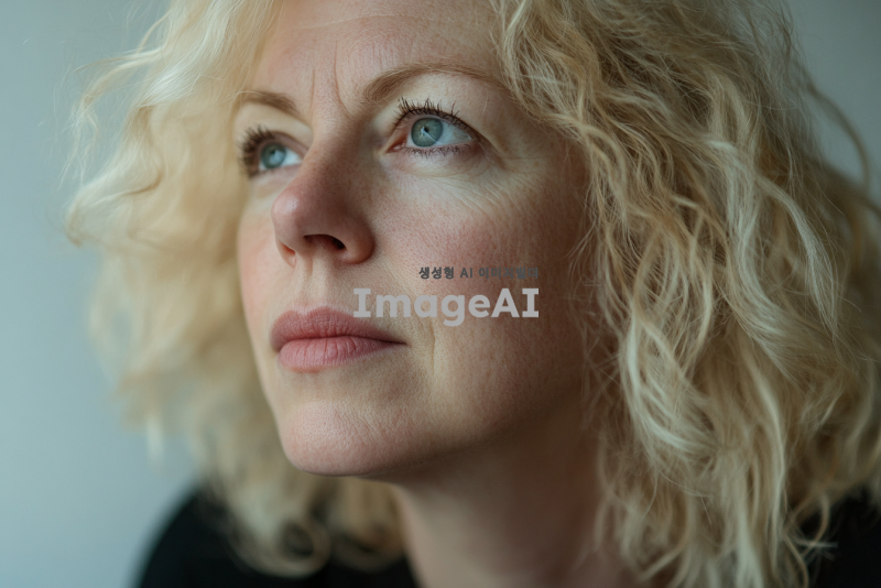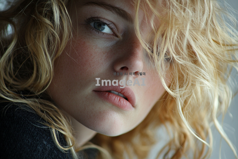 웨이브 금발 백인 여자가 넋이 나간 얼굴을 하고 있다. 살짝 옆으로 틀어진 각도. 클로즈업