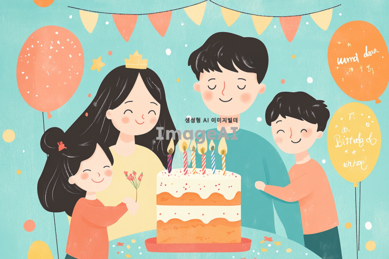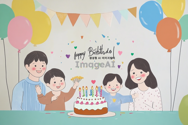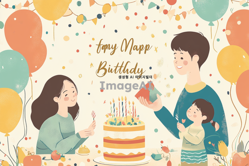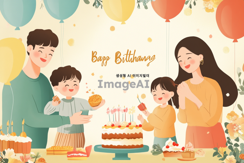 아름다운 생일 축하 카드 디자인, 화려한 색상의 풍선과 케이크, 행복한 한국인 가족이 함께 축하하는 장면, 따뜻한 분위기와 사랑이 넘치는 메시지, 생일 축하 문구가 적힌 예쁜 손글씨 스타일, 아기자기한 일러스트와 함께, 기쁨과 행복이 가득한 느낌