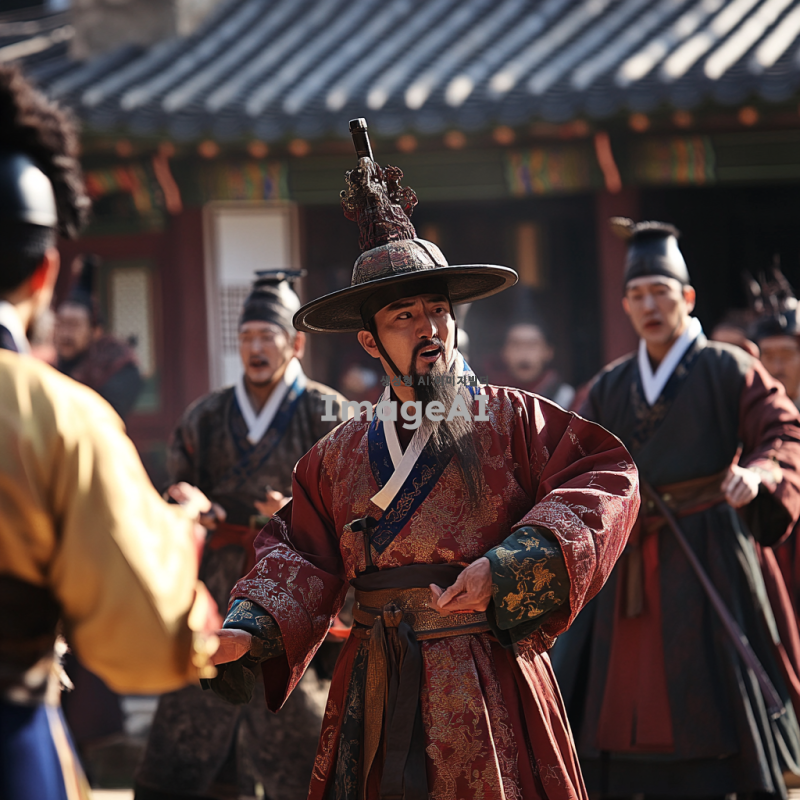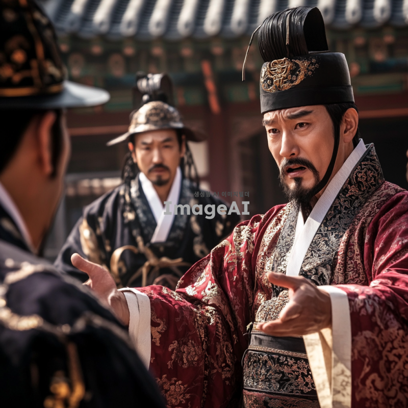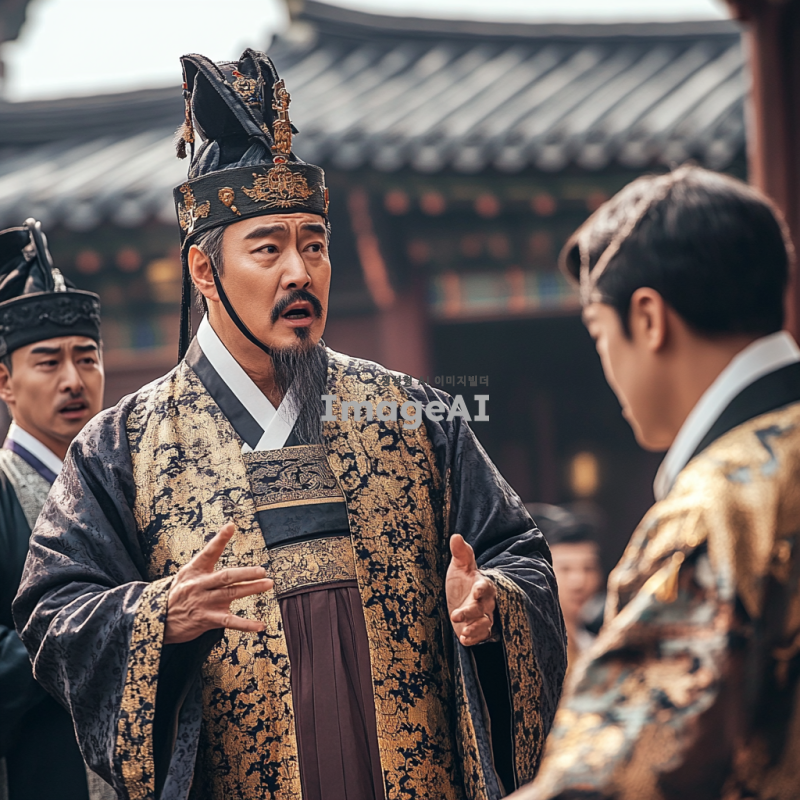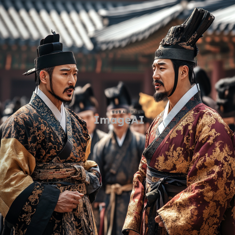 고려시대의 문벌 귀족들이 서로 대립하며 갈등을 벌이는 장면, 화려한 전통 의상을 입은 귀족들이 서로 언쟁을 벌이고 있는 모습, 배경에는 고풍스러운 궁궐이나 전통 건축물, 긴장감 넘치는 표정과 제스처, 역사적인 요소가 잘 드러나는 분위기.