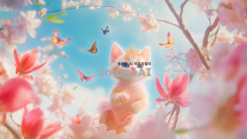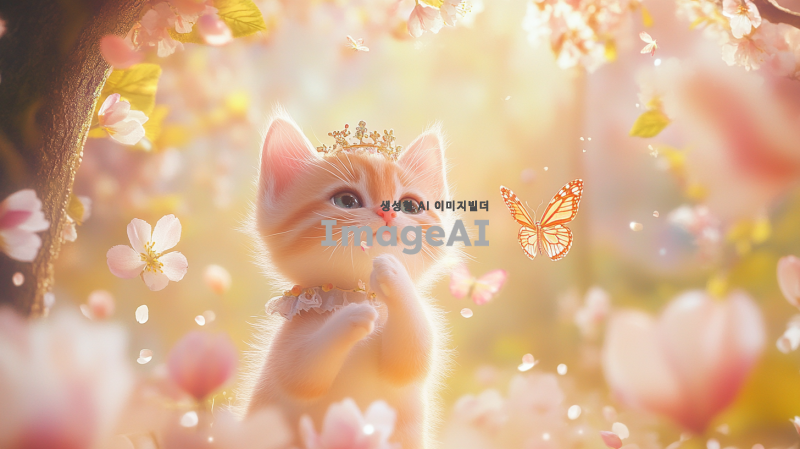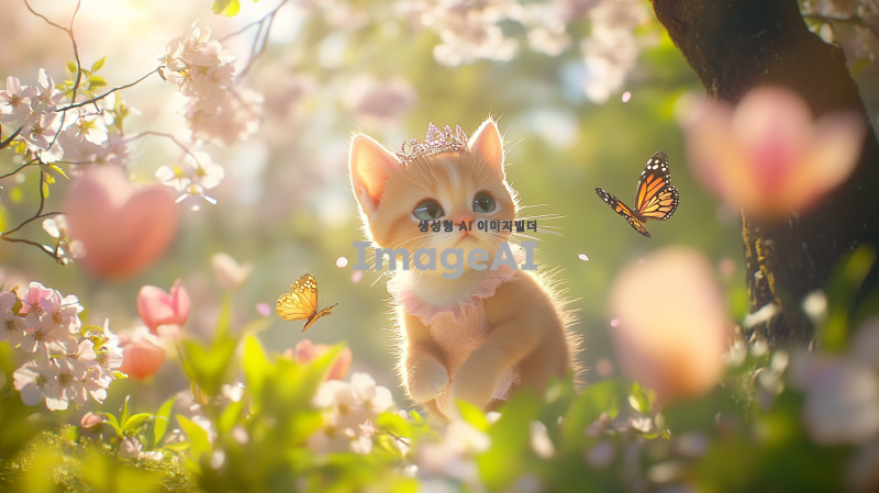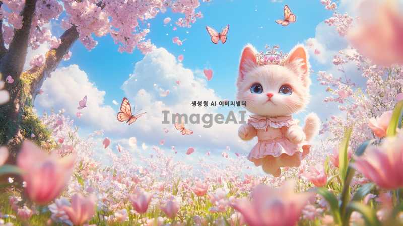 화창한 봄 풍경으로 전환된 화면. 벚꽃과 튤립이 만개해 있는 모습. 나무 아래에서 태어난 '봄'이라는 이름의 아기 고양이. 부드러운 핑크색 털을 가진 활발하고 호기심 많은 모습. 귀여운 짧은 드레스를 입고 머리 위에 귀여운 왕관을 쓴 채, 꽃 사이를 뛰어놀고 있는 모습. 나비와 새들이 날아다니며 바람에 흔들리는 꽃들 속에서 뛰어다니고 있는 '봄'. 모든 생명체가 깨어나는 시점에 친구들을 만나 새로운 시작에 대한 희망을 전파하는 모습.