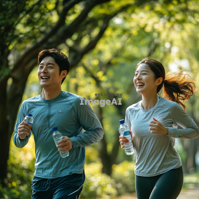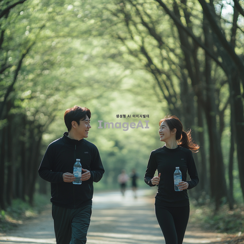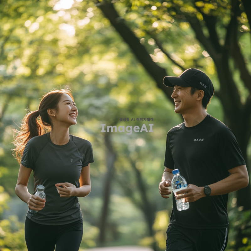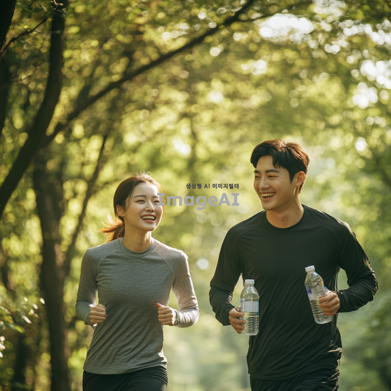 한국의 자연 속에서 스트레스를 관리하고 체력을 증진하는 모습을 담은 장면. 푸른 숲속에서 조깅하는 한국인 남성과 여성, 서로 웃으며 대화를 나누고 있는 모습. 주변에는 맑은 공기와 자연의 소리, 햇살이 비치는 모습이 강조되며, 건강한 라이프스타일을 상징하는 요소들(예: 물병, 운동화, 간단한 운동 도구 등)이 포함된 장면. 이들이 함께하는 활동을 통해 직무 효율성을 높이는 긍정적인 분위기가 느껴지는 이미지. 경찰과 소방관과 운동선수느낌