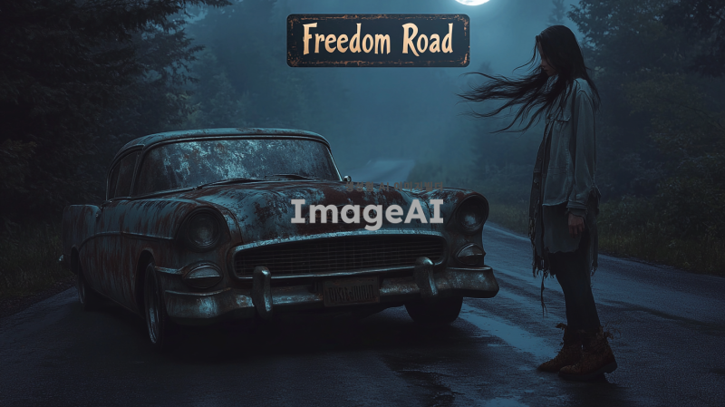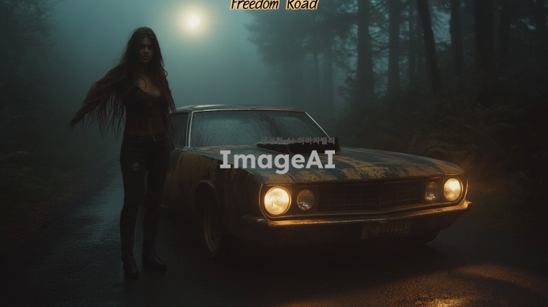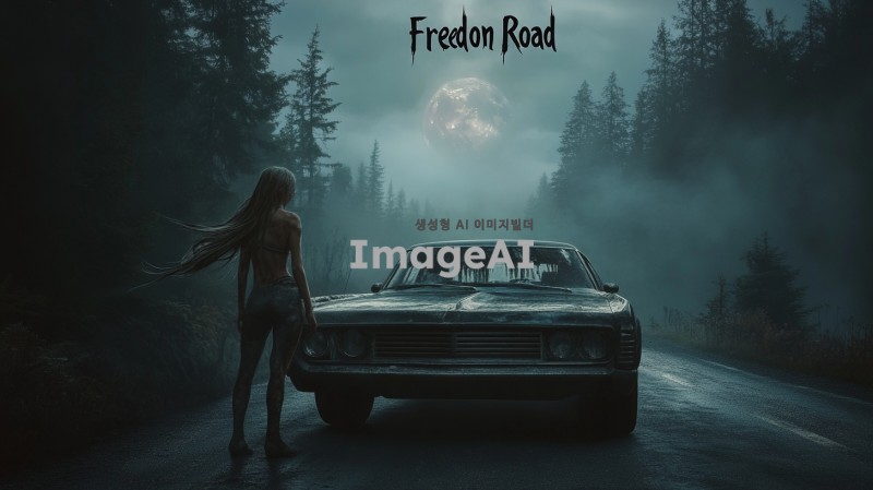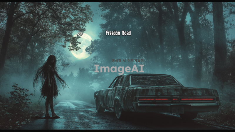 어두운 도로 위에서 한 소녀가 고딕 스타일의 자동차 옆에 서 있는 모습, 소녀는 긴 머리를 흩날리며 긴장한 표정을 짓고 있고, 배경에는 음산한 숲과 흐릿한 달빛이 비치고 있다. 자동차는 낡고 부식된 느낌을 주며, 주변에는 안개가 자욱하게 끼어 있다. 포스터의 상단에는 "자유로"라는 제목이 두드러지게 적혀 있고, 전체적인 색조는 어두운 톤으로 공포감을 조성한다.
