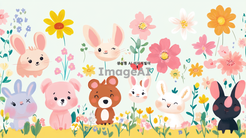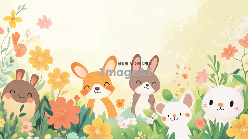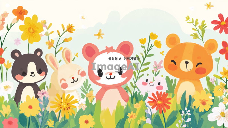 귀엽고 뽀짝한 스타일의 칭찬 스티커판 디자인, 화사한 봄꽃과 밝은 색감, 다양한 동물 캐릭터들이 귀엽게 표현된 모습, 칭찬 문구가 적힌 스티커 10개, 아기자기한 배경과 함께 따뜻한 느낌을 주는 요소들, 전체적으로 사랑스럽고 기분 좋은 분위기.