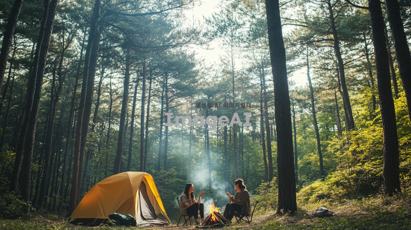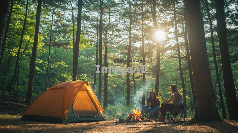 한국의 크고 높은 나무들로 가득한 숲속에서 캠핑을 즐기는 두 명의 여성. 한 여성은 텐트를 설치하고 있고, 다른 여성은 캠프파이어 옆에 앉아 있는 모습. 주변에는 푸른 나무와 자연의 소리가 가득하며, 따뜻한 햇살이 나무 사이로 비치는 장면. 여성들은 편안한 캠핑 복장을 하고 있으며, 즐거운 표정으로 서로 대화하고 있는 모습.
