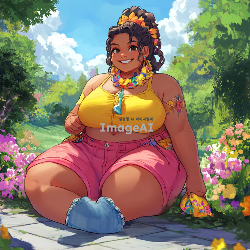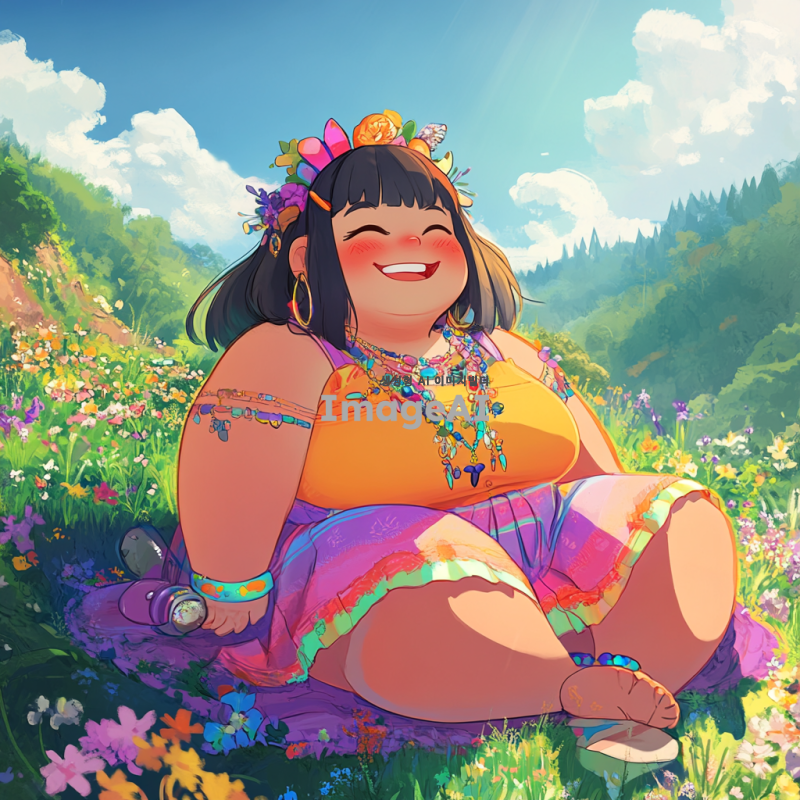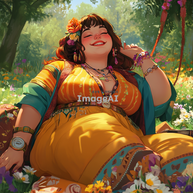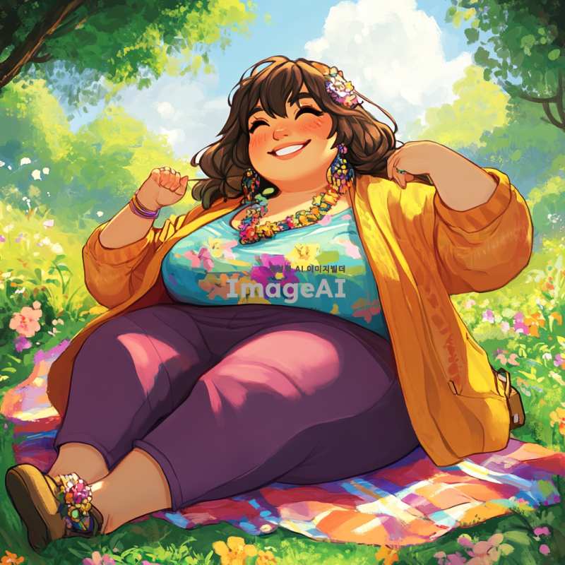 뚱뚱한 카리나가 웃으며 앉아 있는 모습, 화사한 색상의 옷을 입고 다양한 스타일의 액세서리를 착용한 모습, 따뜻한 햇살 아래에서 친구들과 함께 즐거운 시간을 보내고 있는 장면, 배경에는 아름다운 공원이 펼쳐져 있고, 주변에는 꽃과 나무가 가득한 자연의 풍경.
