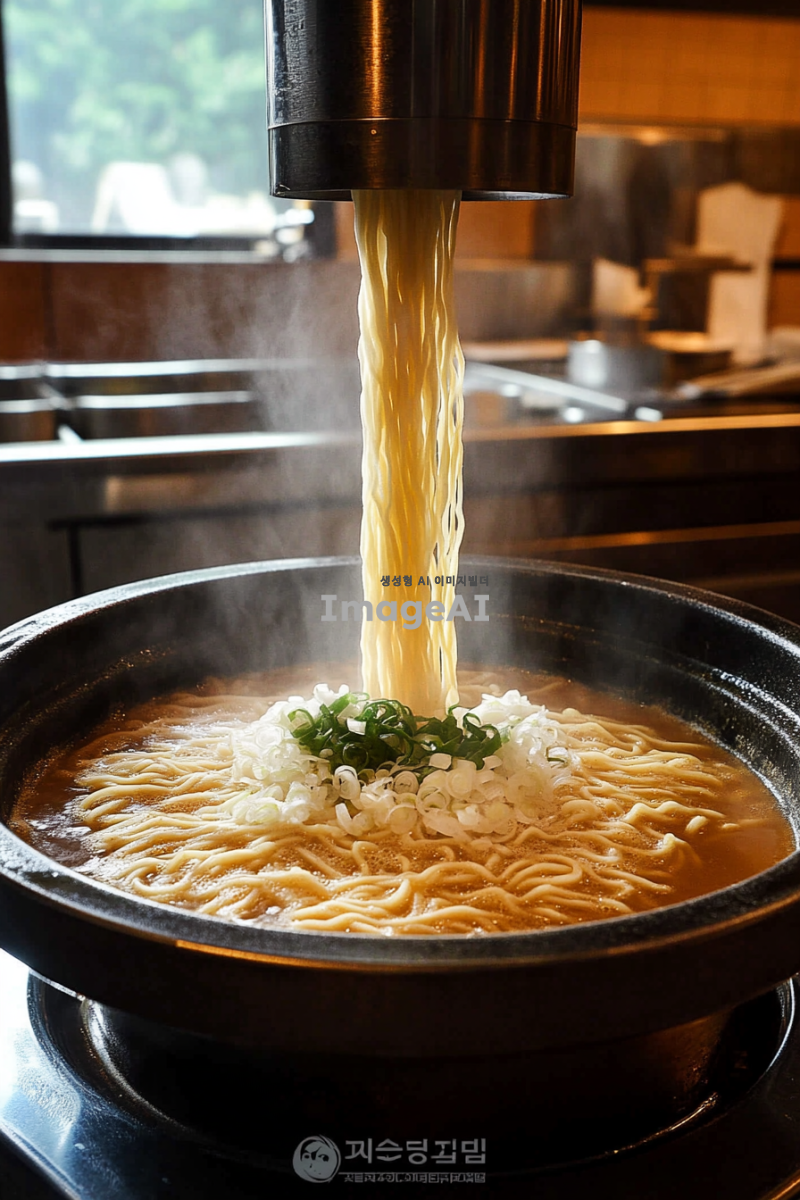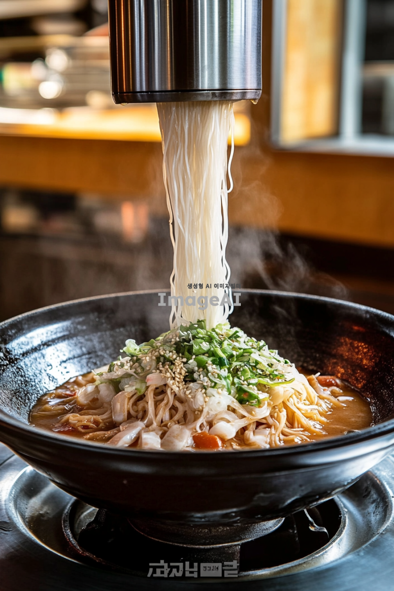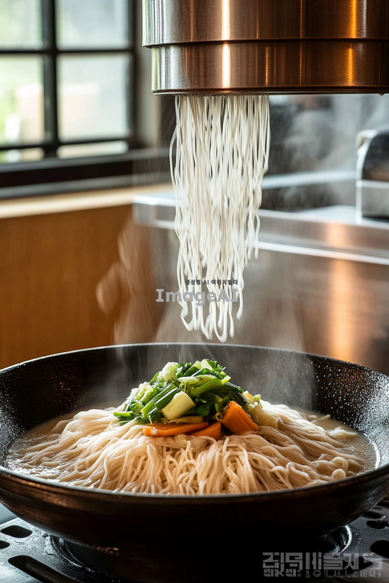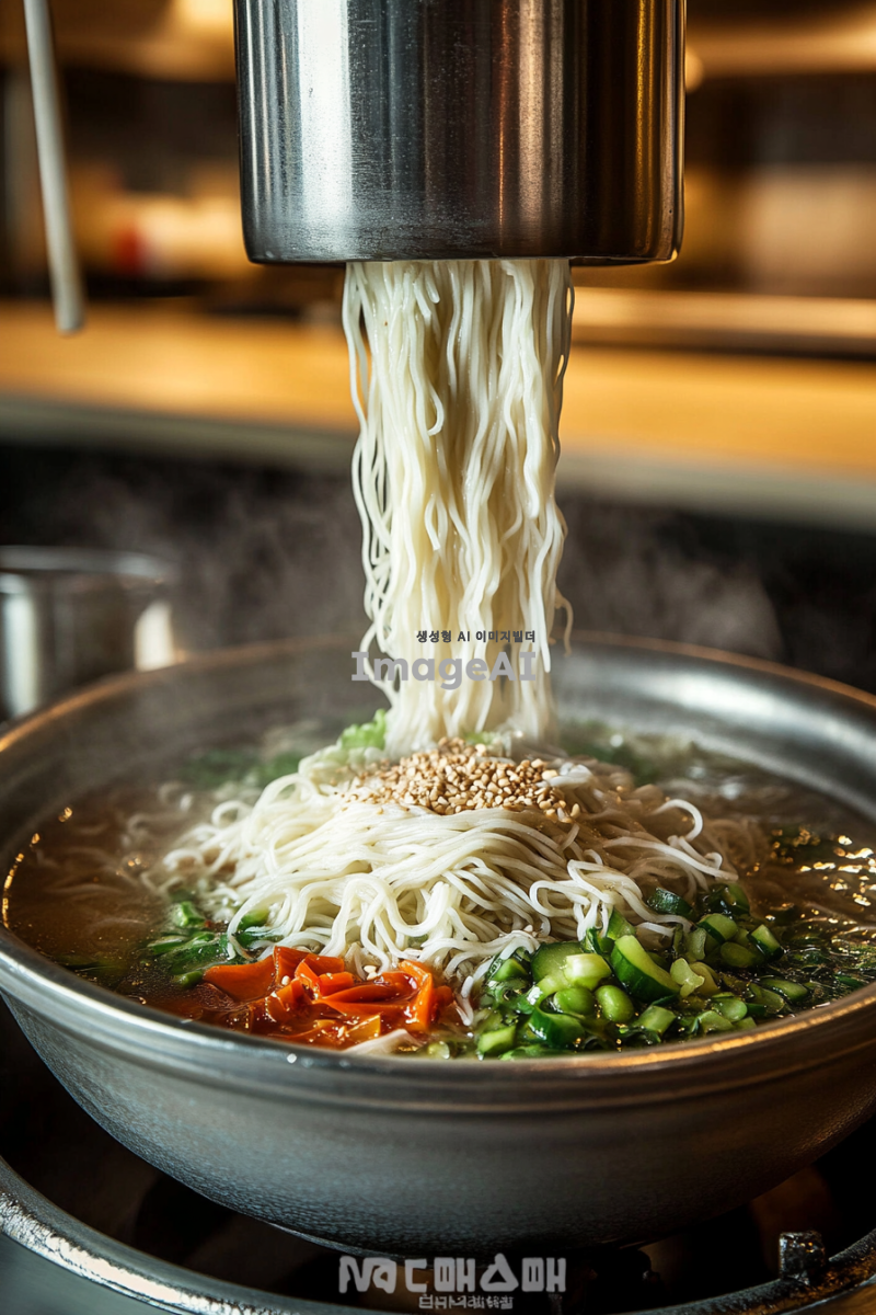 한국 전통 기계냉면, 시원한 육수에 담긴 면발, 신선한 채소와 고명, 정갈하게 담아낸 그릇, 여름철 더위에 어울리는 모습, 배경은 한국의 전통식당, 따뜻한 조명 아래에서의 아늑한 분위기