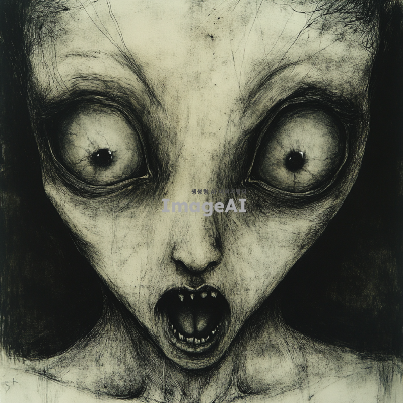 메뚜기 같은 이마, 달팽이 구멍 같은 눈, 입술까지 닿은 코, 주먹 두 개가 드나드는 큰 입을 가진 못생긴 여성 얼굴을 그려줘. 피부는 창백하고, 머리카락은 지저분하게 흩날리며, 배경은 어두운 색조로 설정해 분위기를 강조해줘.
