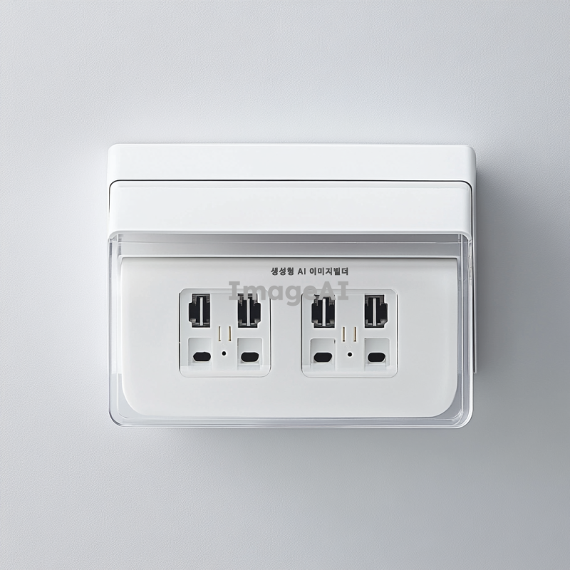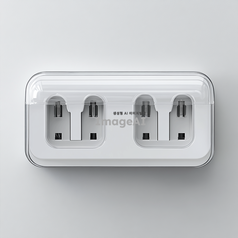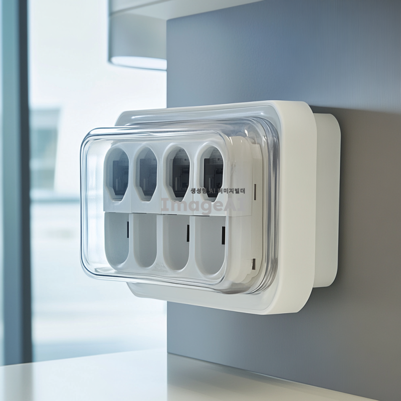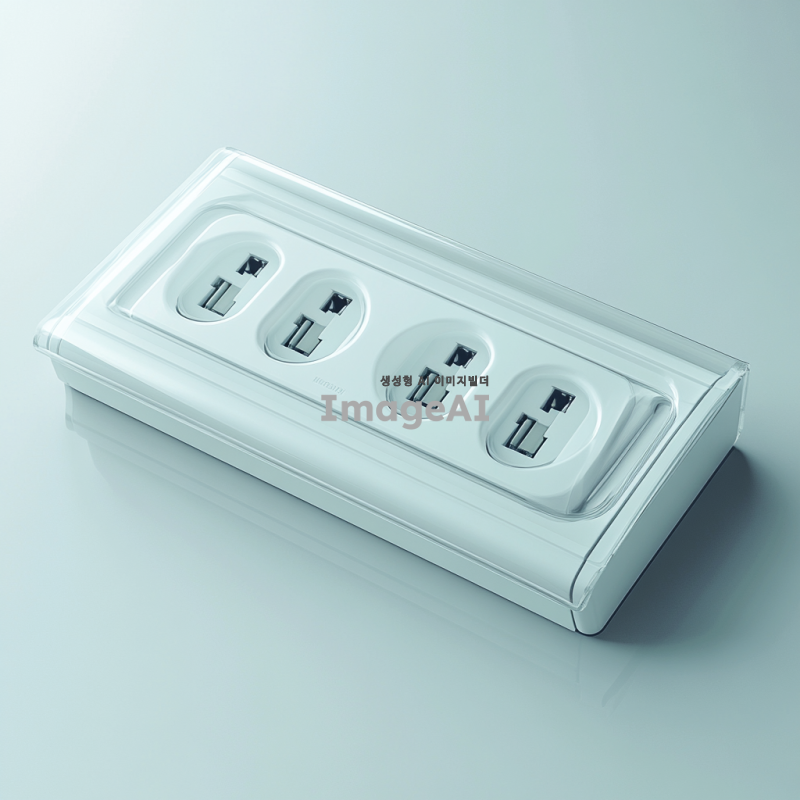 직사각형 형태의 멀티탭 본체를 중심으로, 두 개의 전원 플러그 삽입부가 있는 디자인. 각 콘센트에는 반투명 유연소재로 제작된 슬라이드 롤커버가 부착되어 있으며, 커버가 이동할 수 있도록 안내 레일이 설치되어 있음. 내부에는 자동 복귀를 위한 복귀 스프링 구조가 포함되어 있어 선택적으로 적용 가능. 커버를 고정하고 이동을 유도하는 지지 프레임이 있으며, 내부 압력 구조를 통해 차일드락 잠금핀 기능이 있는 안전 장치가 장착된 모습. 전체적으로 현대적이고 실용적인 디자인을 강조.