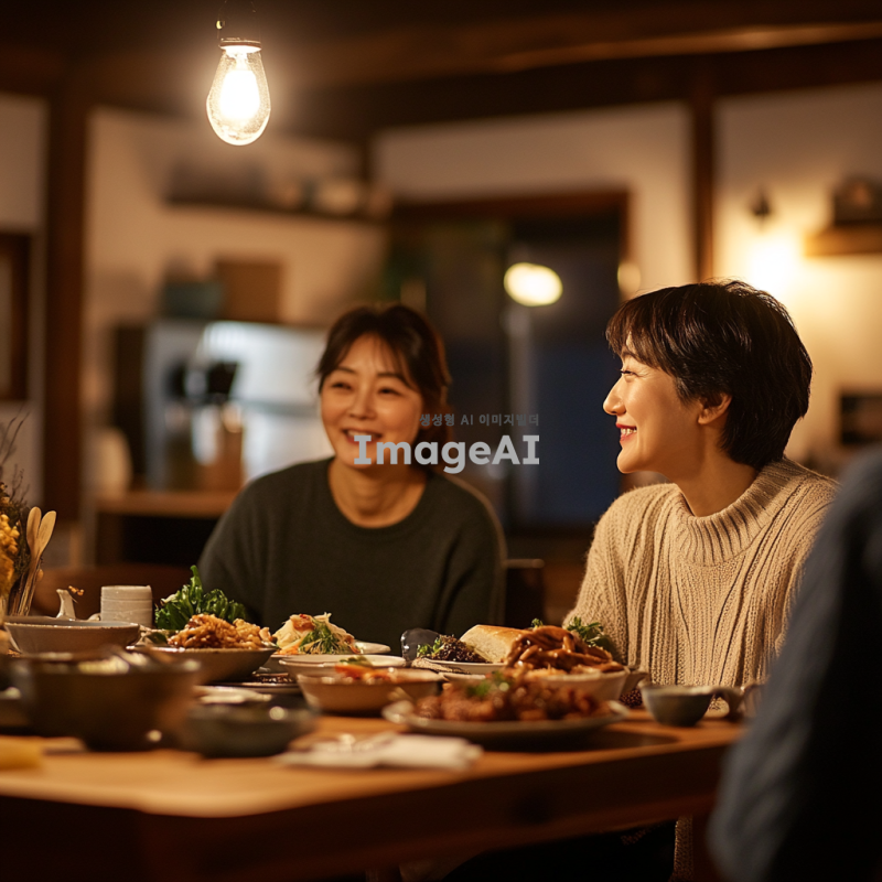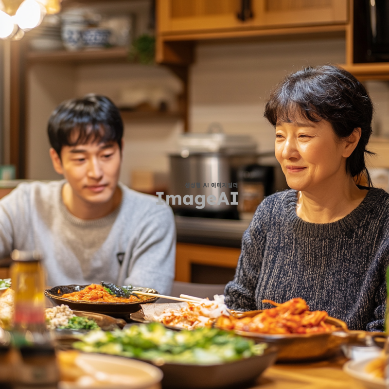 무표정한 표정의 살가운 엄마와 함께 식사하는 청년을 바라보는 중년 여성의 모습. 중년 여성은 따뜻한 눈빛으로 청년을 바라보고 있으며, 식탁에는 정갈하게 차려진 한식이 놓여 있다. 배경은 아늑한 가정의 주방으로, 따뜻한 조명 아래 편안한 분위기가 느껴진다.