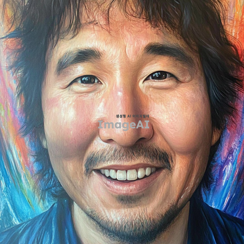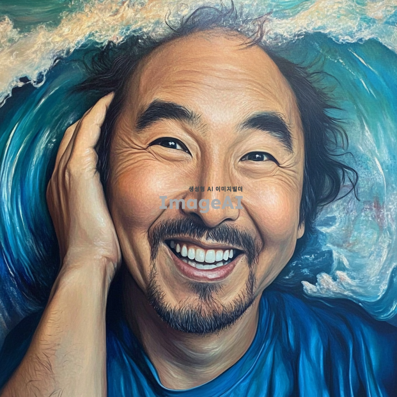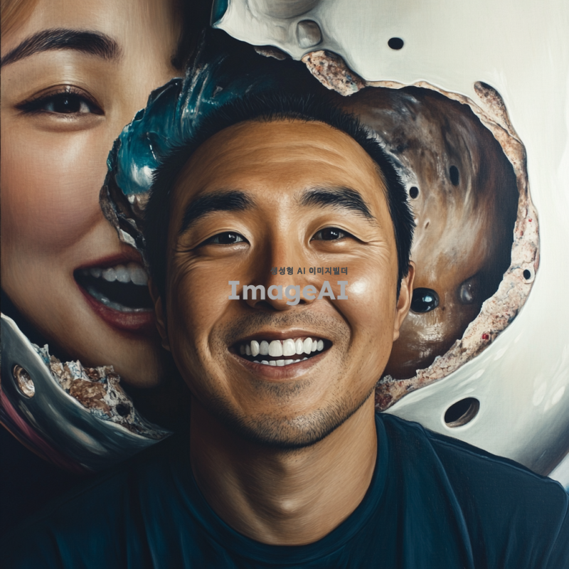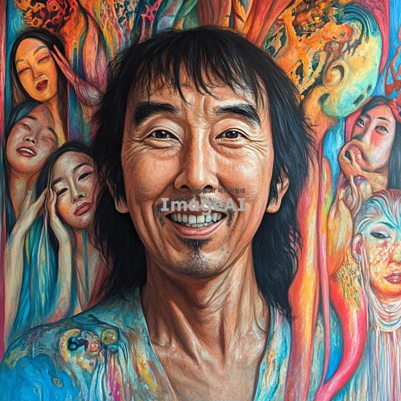 밝고 긍정적인 배경 속에서 웃고 있는 한국인 남성의 자화상. 외적으로는 행복한 표정을 짓고 있지만, 내면의 고통과 부정적인 감정을 상징적으로 표현. 얼굴의 일부는 어두운 색조로 그려져 내면의 갈등을 나타내고, 주변은 화사한 색감으로 대비를 이루며 긍정적인 분위기를 강조.