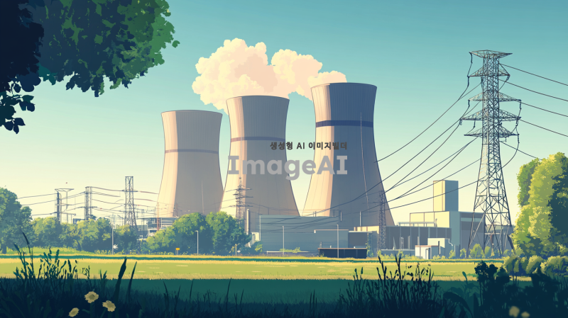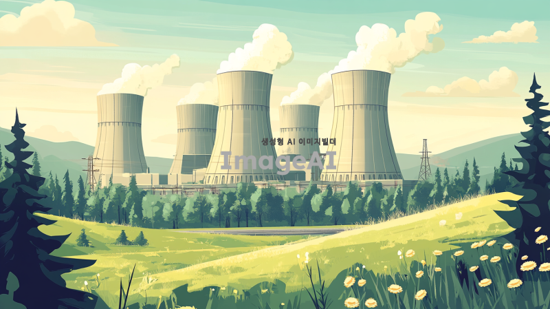 대형 원자력 발전소의 외관을 간단한 일러스트 스타일로 표현한 이미지. 발전소의 특징적인 냉각탑과 구조물을 강조하고, 주변 환경은 자연과 조화를 이루는 모습으로 그려주세요. 맑은 하늘과 푸른 나무들이 있는 배경을 추가하여 친환경적인 느낌을 주고, 발전소의 안전성과 기술적 요소를 부각시키는 디자인으로 만들어주세요.