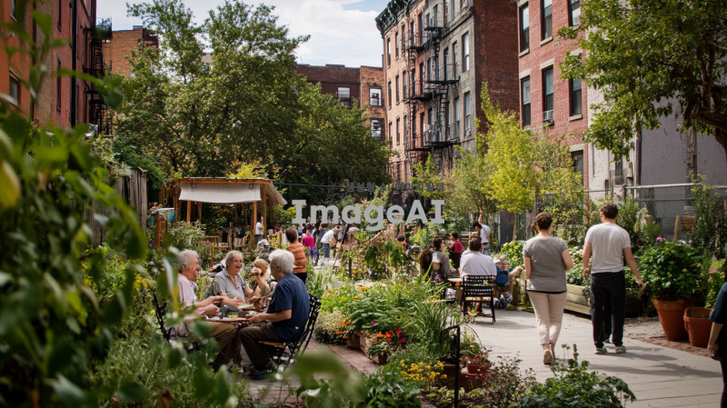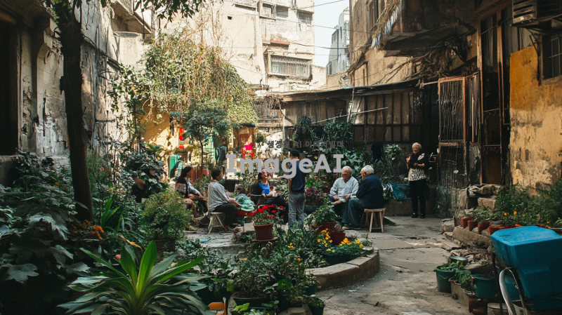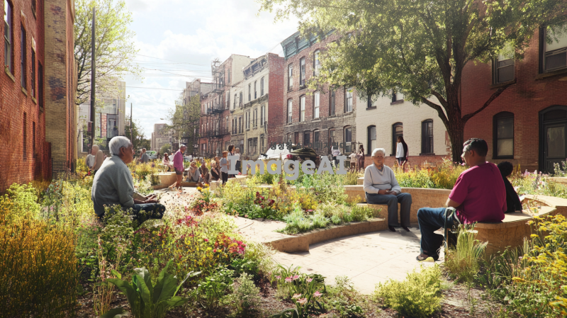 낡고 오래된 건물이 많은 지역에서 활기차고 화사한 포켓파크가 조성된 모습. 다양한 연령대의 사람들이 웃으며 소통하고 있는 장면, 고령자들이 편안하게 앉아 대화를 나누고 있는 모습, 주변의 오래된 건물들과 대조되는 생기 넘치는 식물과 꽃들, 햇빛이 비추는 따뜻한 분위기. 이 공간이 사람들에게 심리적 안녕감을 제공하며, 지역 사회의 활력을 불어넣는 모습을 담아주세요.