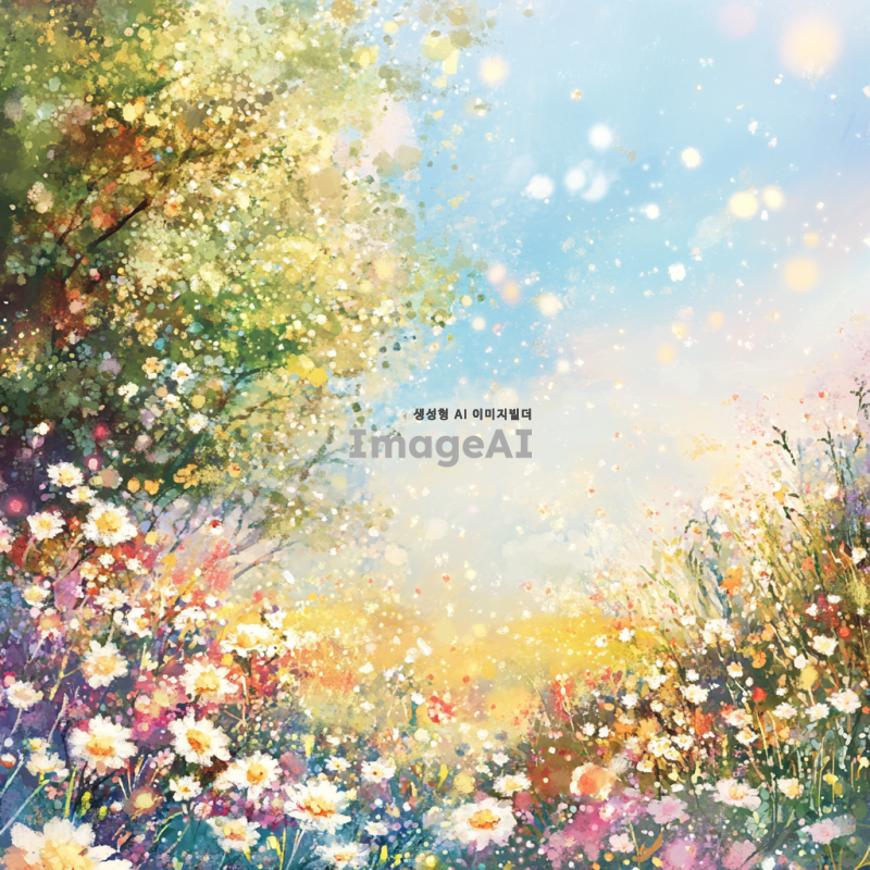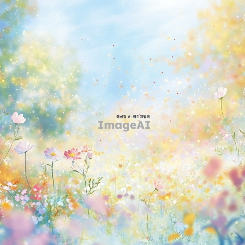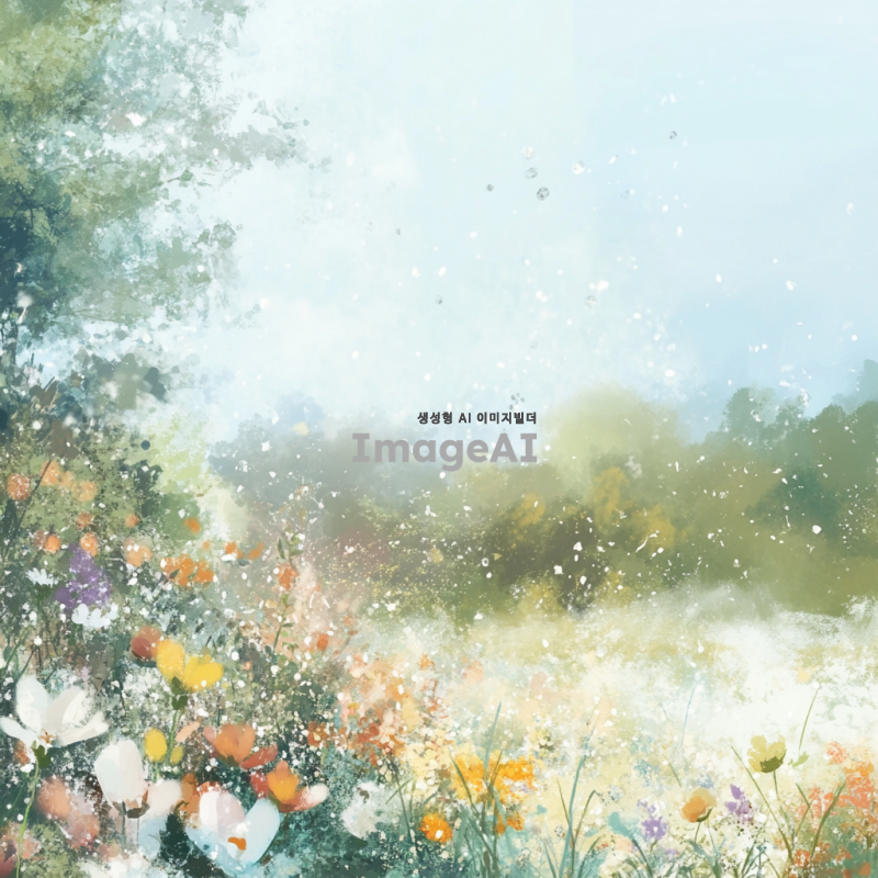 창 밖의 꽃가루가 바람에 날리는 모습을 수채화 일러스트 스타일로 표현한 이미지. 부드러운 색감과 흐릿한 경계, 자연의 아름다움을 강조하며, 따뜻한 햇살이 비추는 풍경 속에서 꽃가루가 춤추듯 흩날리는 장면. 다양한 꽃의 색깔이 조화롭게 어우러져 있으며, 배경에는 푸른 하늘과 나무들이 보인다.