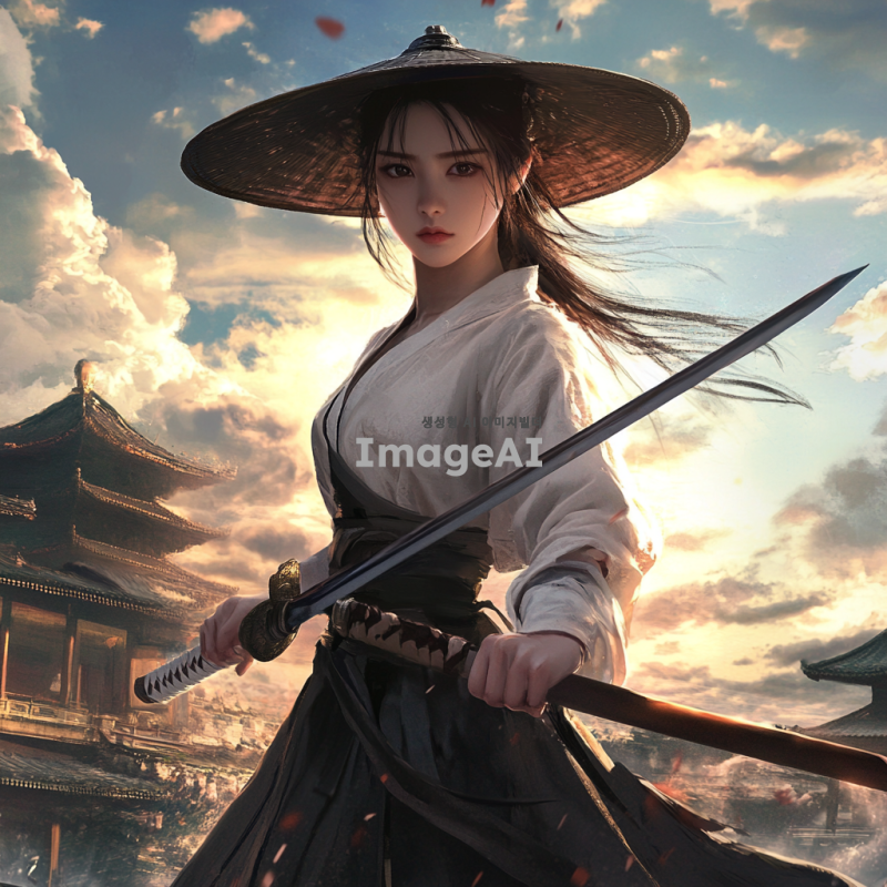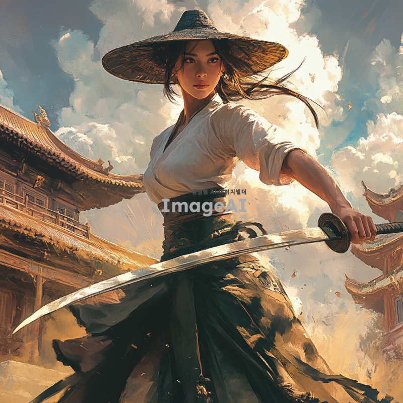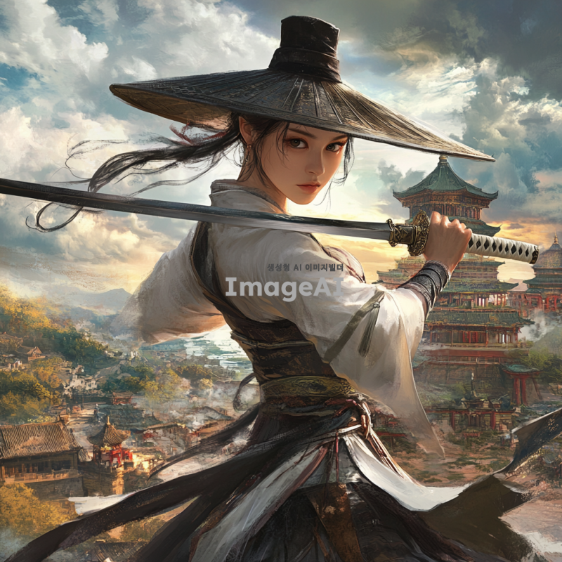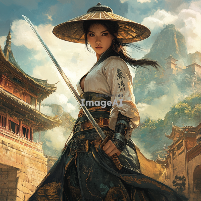 갓을 쓰고 칼을 든 무협지 여주인공, 전통적인 치마를 입고 강인한 표정으로 서 있는 모습, 배경은 고전적인 중국 풍경, 구름이 드리운 하늘 아래, 동양의 전통적인 건축물과 함께, 강렬한 눈빛과 우아한 자세로 전투 준비 자세를 취하고 있는 모습.