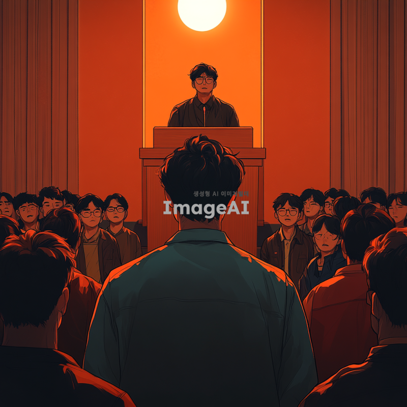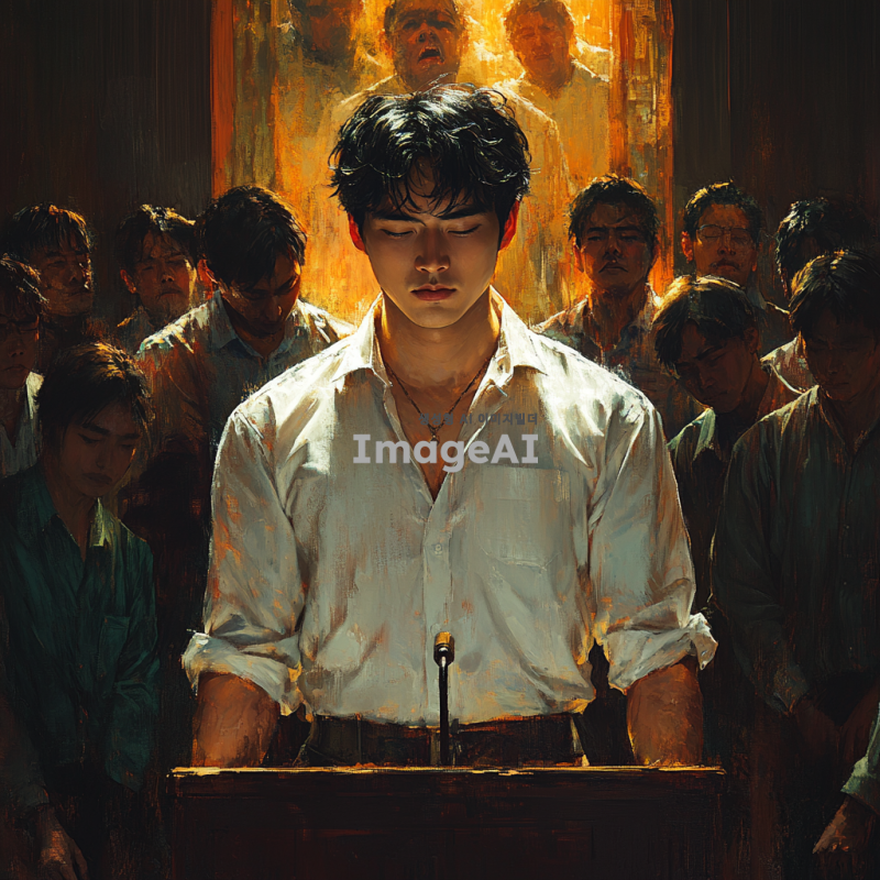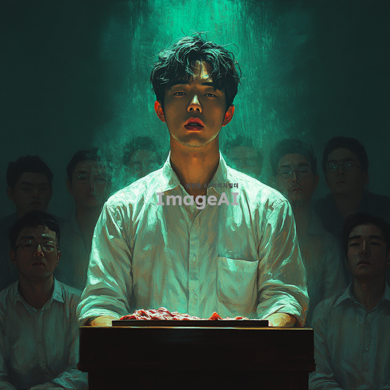 대학에 진학하면서 삶의 변화와 고난을 겪는 한국인 청년의 이야기를 담은 이미지. 고깃집에서 일하는 청년의 모습, 매니저가 협박하는 장면, 그리고 교회에 처음 가서 화려한 분위기를 느끼는 순간을 그려내고 싶다. 매니저가 단상에서 기도하는 모습과 그를 둘러싼 사람들, 그들의 얼굴이 악마의 가면을 쓴 듯한 기괴한 분위기를 강조해 표현한다. 전체적인 색감은 어두운 톤과 화려한 조명의 대비를 통해 긴장감과 혼란을 느낄 수 있도록 한다.
