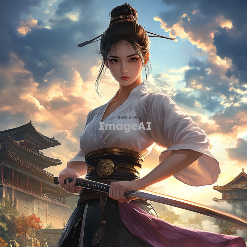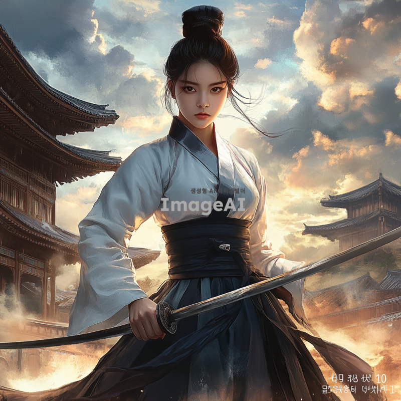 상투를 튼 한국 여성 무협지 주인공이 전통적인 치마를 입고 강인한 표정으로 서 있는 모습. 배경은 고전적인 중국 풍경으로, 구름이 드리운 하늘 아래 동양의 전통적인 건축물이 보인다. 그녀는 강렬한 눈빛과 우아한 자세로 전투 준비 자세를 취하고 있다.