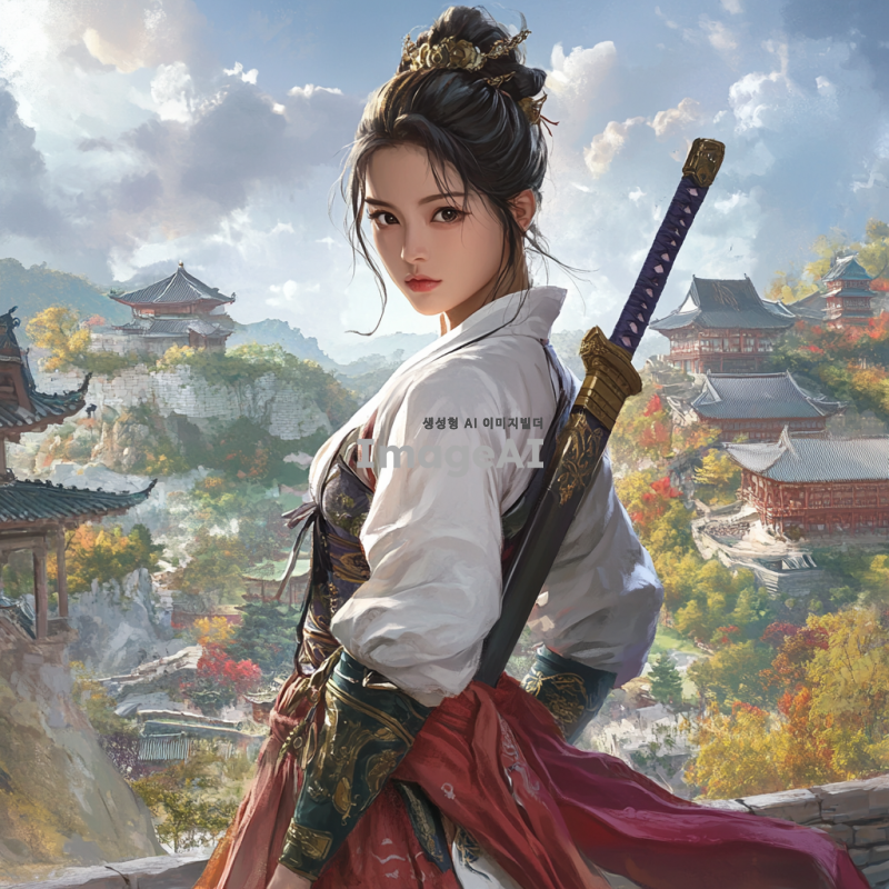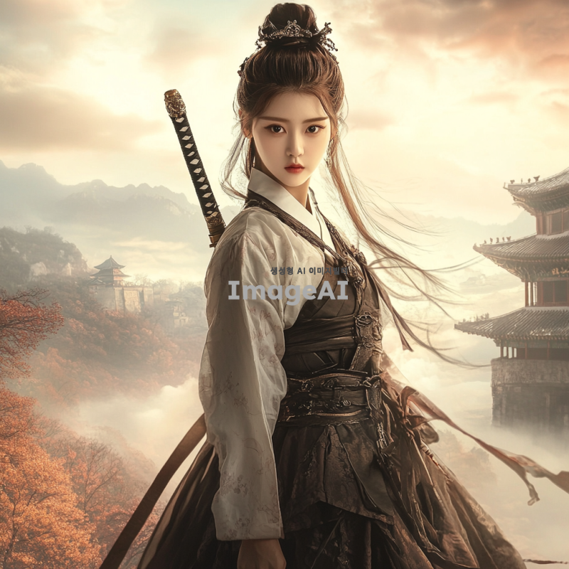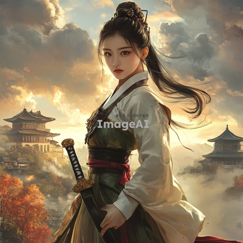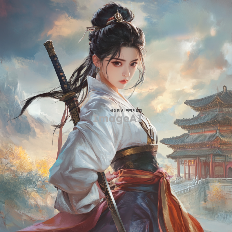 상투를 큰 비녀로 튼 한국 여성 무협지 여주인공이 전통적인 치마를 입고 강인한 표정으로 서 있는 모습. 배경은 고전적인 중국 풍경으로, 구름이 드리운 하늘 아래 동양의 전통적인 건축물과 함께 어우러져 있다. 그녀는 칼집과 칼을 들고 있으며, 강렬한 눈빛과 우아한 자세로 전투 준비 자세를 취하고 있다.