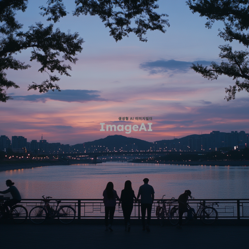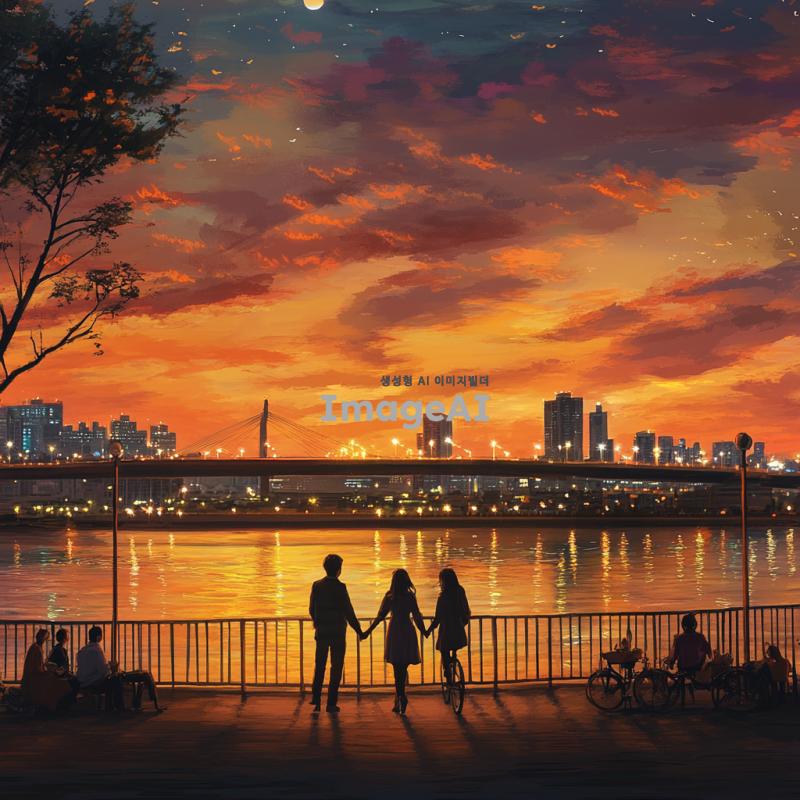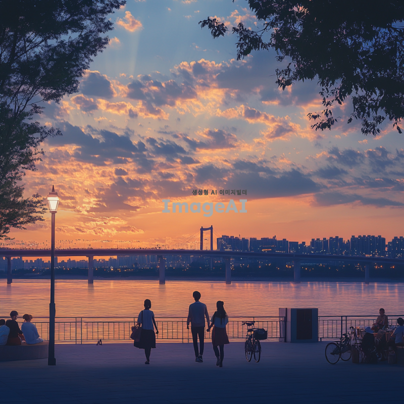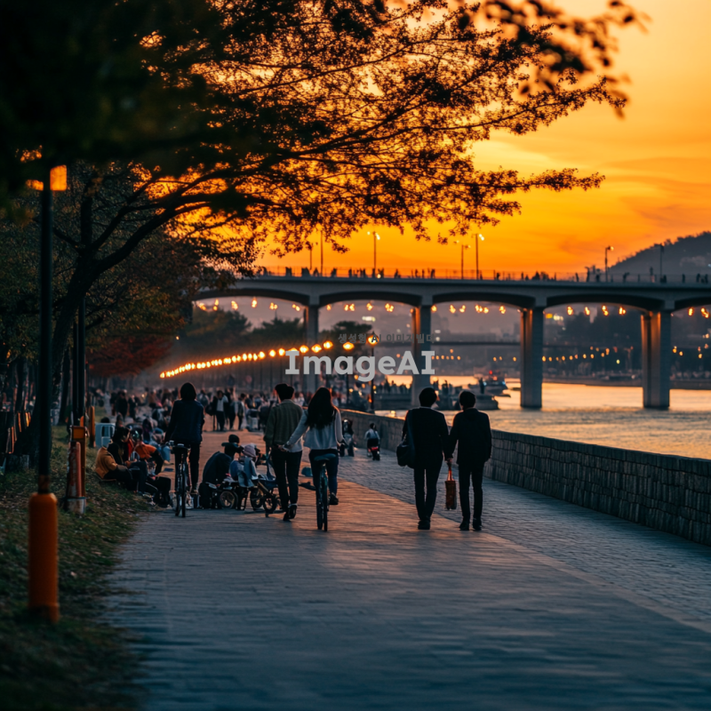 한강에서의 로맨틱한 데이트 장면, 노을이 지는 하늘 아래 연인들이 손을 잡고 산책하는 모습, 주변에는 자전거를 타는 사람들과 피크닉을 즐기는 가족들, 잔잔한 물결과 함께 흐르는 음악, 따뜻한 분위기의 조명과 함께하는 야경, 한국의 전통적인 소품이 어우러진 풍경.