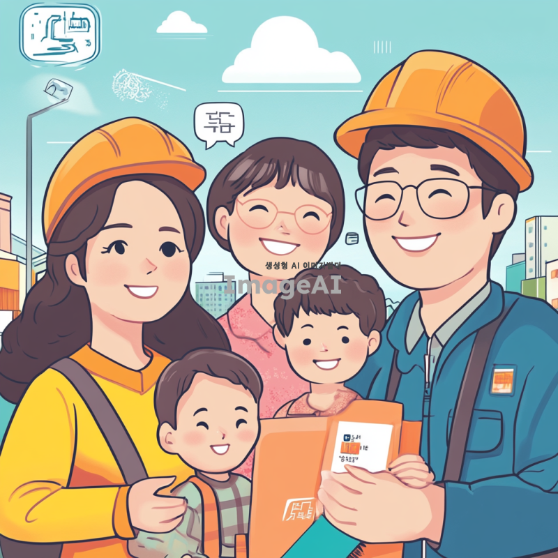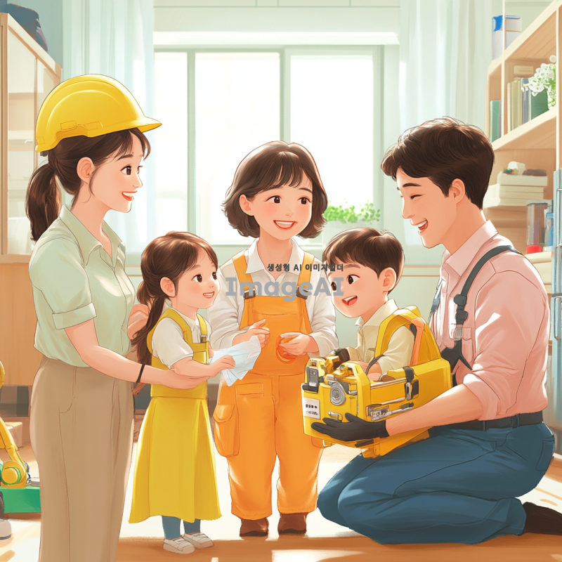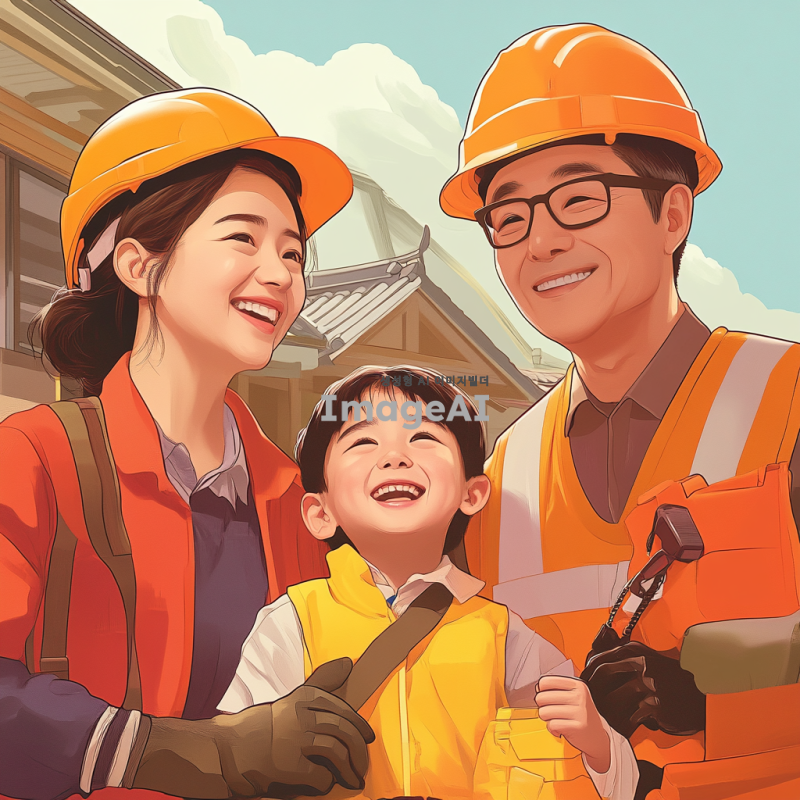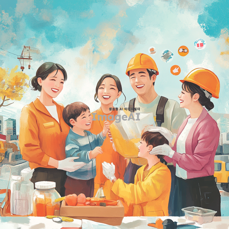 안전하고 건강한 생활을 위한 표어를 제안하는 장면, 한국인 가족이 함께 모여 안전 교육을 받으며 웃고 있는 모습, 밝고 따뜻한 색감으로 표현, 안전 장비를 착용한 모습과 함께 안전 관련 아이콘들이 배경에 어우러져 있는 이미지.
