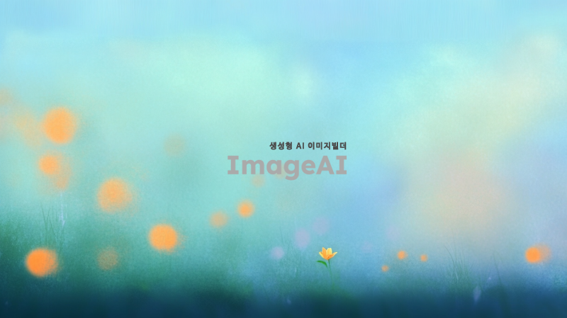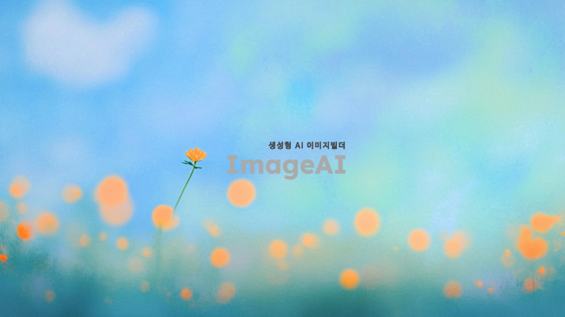 흐릿한 배경의 파란색과 초록색, 전경에는 주황색 점들이 있어 추상 인상파 화풍을 만들어냅니다. 하늘은 파란색에 하얀 구름이 떠 있습니다. 전경의 부드러운 초점에는 작은 노란 꽃 하나가 있습니다. 꿈같고 평화로운 느낌을 줍니다. 색상은 부드러운 가장자리를 가지고 있어 부드러운 느낌을 줍니다. 위쪽에는 텍스트나 그래픽을 위한 더 많은 공간이 있는 것처럼 보입니다. 이는 바탕화면으로 잘 어울리는 차분한 분위기를 만들 수 있습니다.
