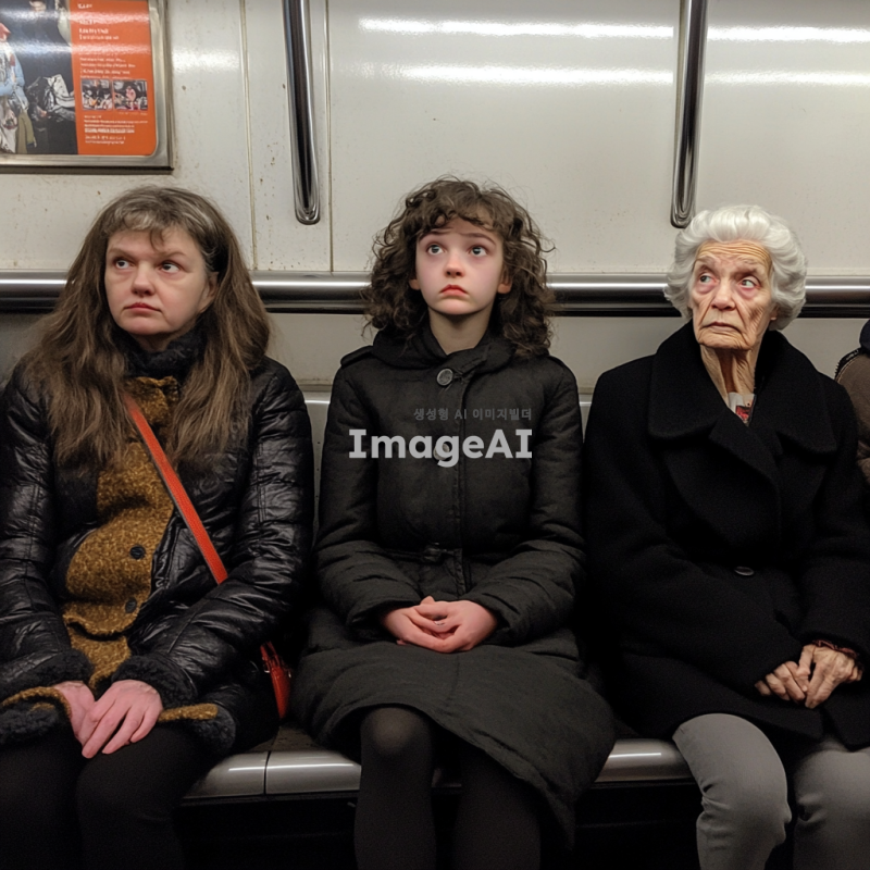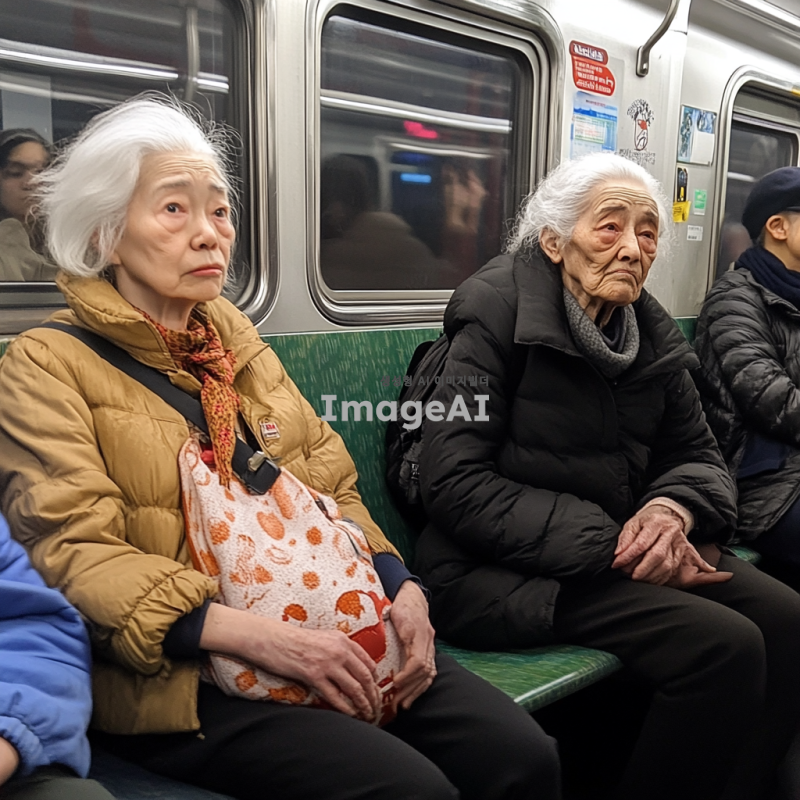 지하철 노약자 자리에 앉아있는 여자아이와 그걸 째려보는 등 굽은 할머니, 그리고 그 여자애의 미래 노인 모습이 후회하는 표정으로 지켜보고 있어!