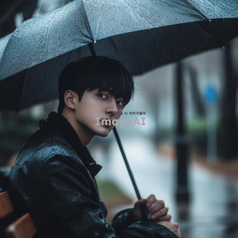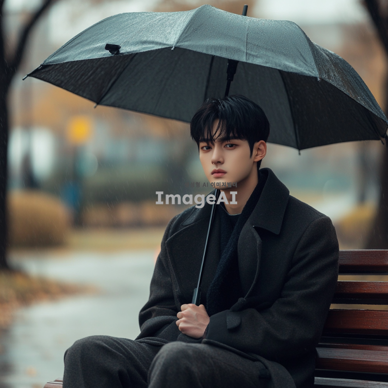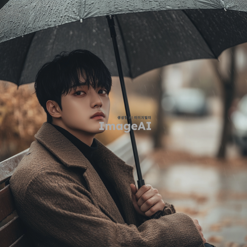 최주희에게 차인 신민규, 슬퍼 보이는 표정으로 공원 벤치에 앉아 있는 모습, 비 오는 날의 흐릿한 배경, 우산을 쓰고 있는 모습, 감정이 담긴 눈빛, 한국의 도시 풍경, 차가운 색감, 우울한 분위기