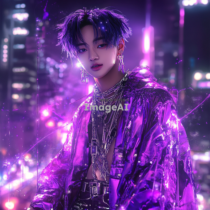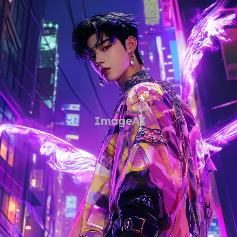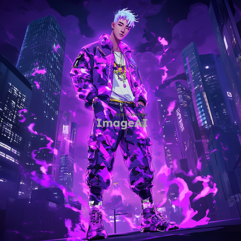 보라색 배경에 서 있는 한국 남자 캐릭터, 애니메이션 스타일, 화려한 의상과 개성 있는 헤어스타일, 밝고 생동감 넘치는 표정, 주변에 신비로운 보라색 효과와 빛나는 요소들, 현대적인 도시 풍경을 배경으로 한 장면.