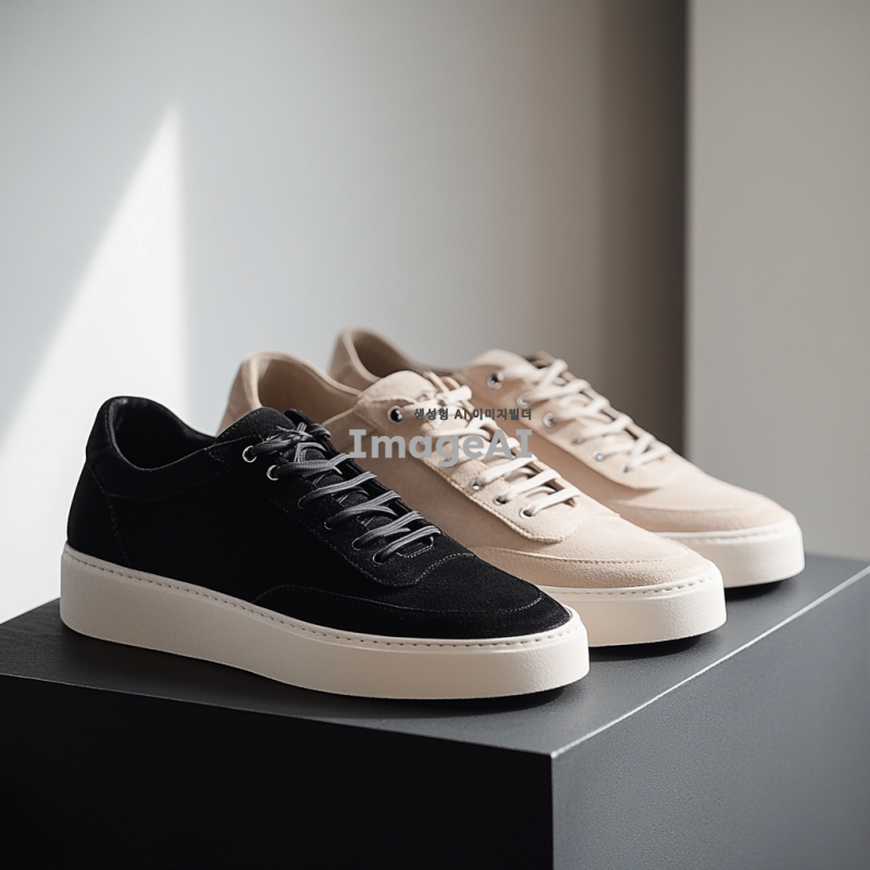 스웨이드 소재로 제작된 25FW 발레코어 스니커즈 디자인, 신발끈은 넓고 아일렛이 있는 형태, 모던하고 세련된 스타일, 다양한 색상 조합, 편안한 착용감 강조, 발레의 우아함과 스니커즈의 실용성을 결합한 디자인, 배경은 심플하고 깨끗한 느낌으로.
