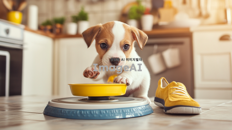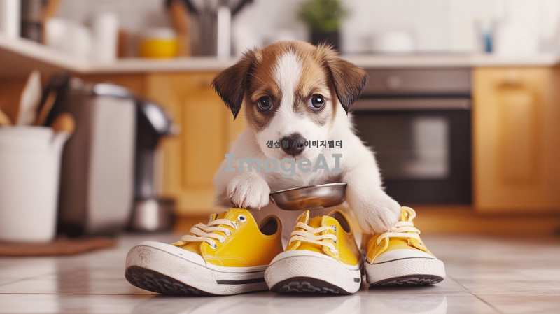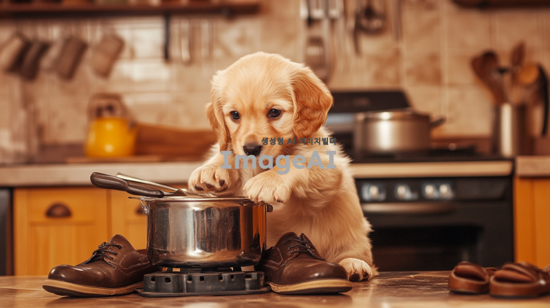 강아지가 주방의 신발 위에서 요리하고 있는 모습, 귀여운 강아지가 주방 도구를 사용하고 있는 장면, 신발 위에 앉아 요리하는 강아지의 모습, 아기자기한 주방 배경, 강아지의 표정이 재미있고 사랑스러운 느낌, 밝고 따뜻한 조명, 생동감 있는 색감