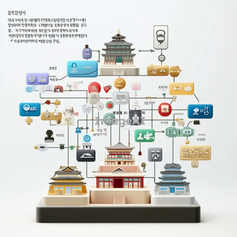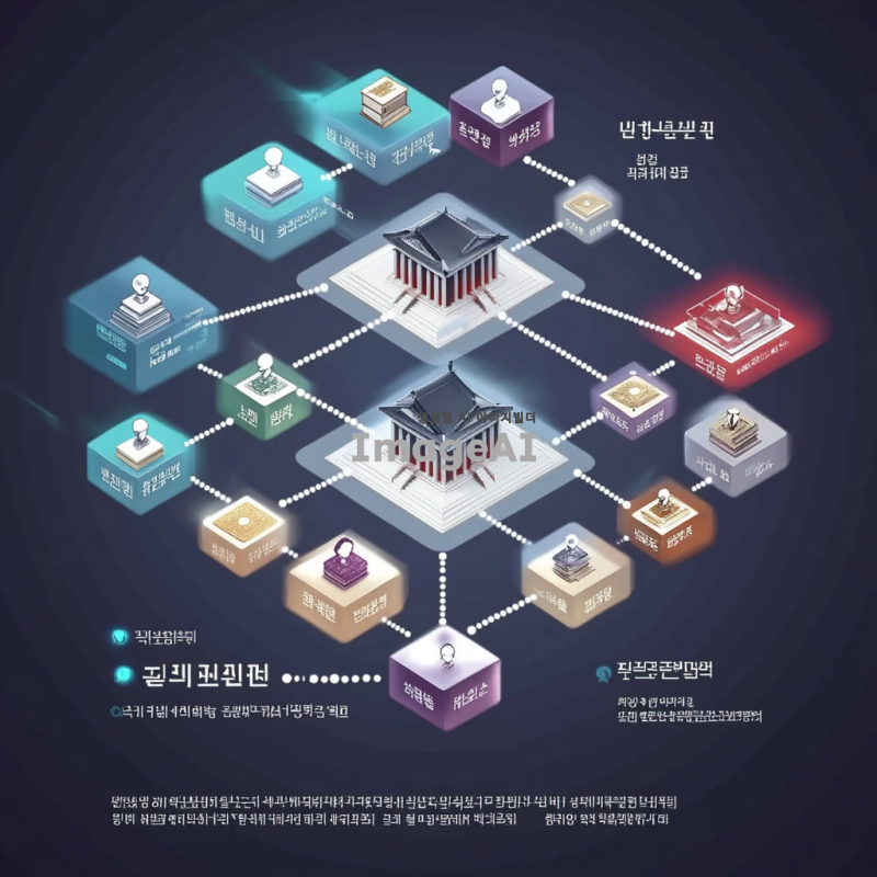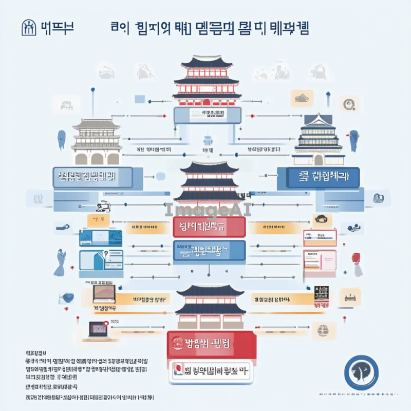 한국 정부가 민영화하려는 두 개의 대형 은행에서 얼마의 돈을 보유해야 하는지를 보여주는 한국식 차트로, 위의 다이어그램에서 나타난 세 가지 주요 문화 발전으로 나뉘어 있습니다. 차트에는 아티스트를 나타내는 아이콘, 로고에 있는 주의 수역, 그리고 디자인의 일부 로고에 AI 상징이 포함되어 있으며, 언리얼 엔진 스타일입니다.
