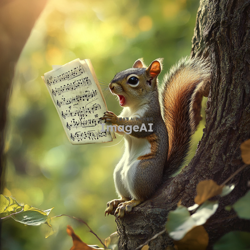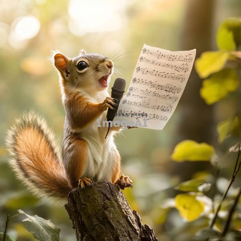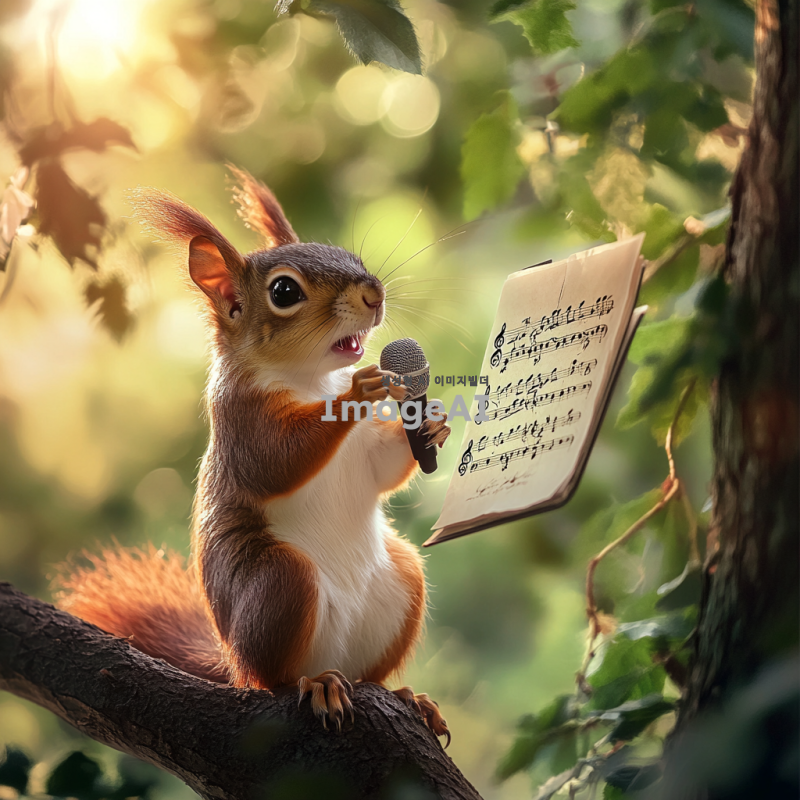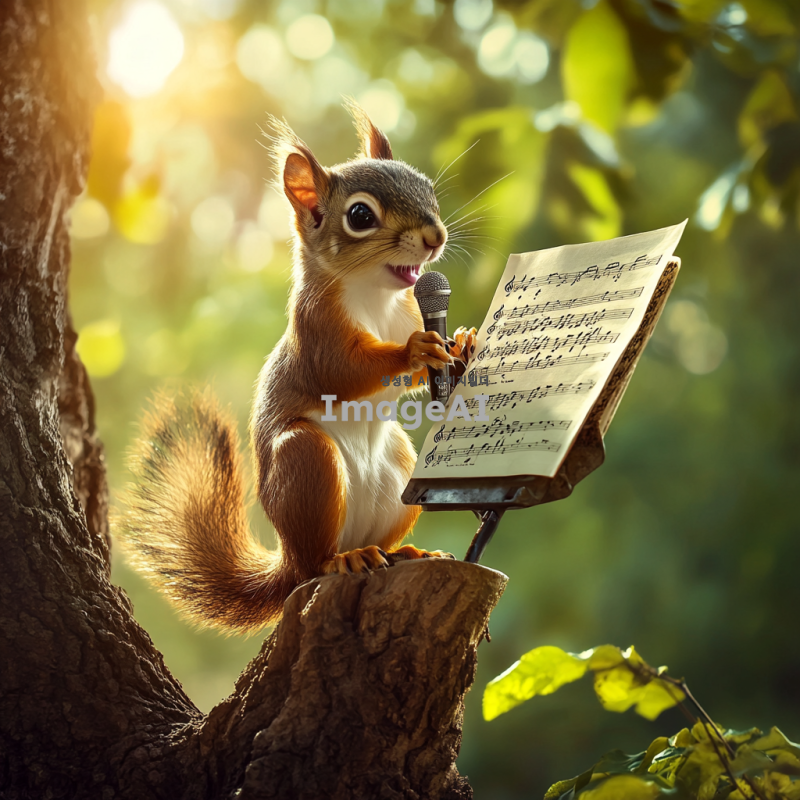 나무 위에서 악보를 보며 마이크를 들고 노래 부르는 다람쥐, 귀여운 표정과 생동감 있는 자세, 자연의 푸르른 배경, 햇살이 비치는 따뜻한 분위기, 음악에 몰입하는 모습.