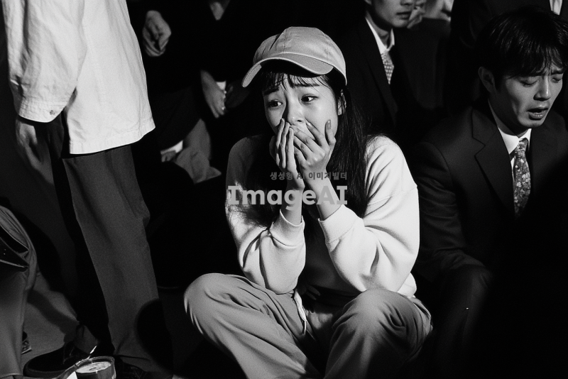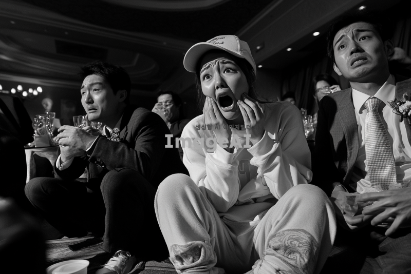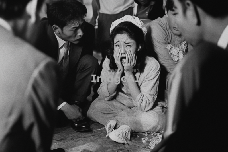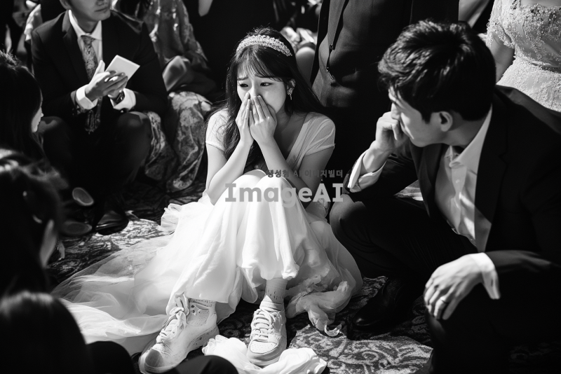 결혼식장 하개들 사이에서 바닥에 주저 앉아 입을 틀어 막으며 대성통곡하는 캡모자를 쓰고 츄리닝바지에 왼쪽 발만 슬리퍼를 신은 한국인 여자의 뒷모습. 오른쪽 슬리퍼는 벗겨져 있다. 수트를 입은 남성 두명이 여자를 끌고 나가려 한다.