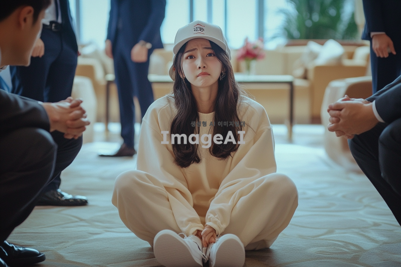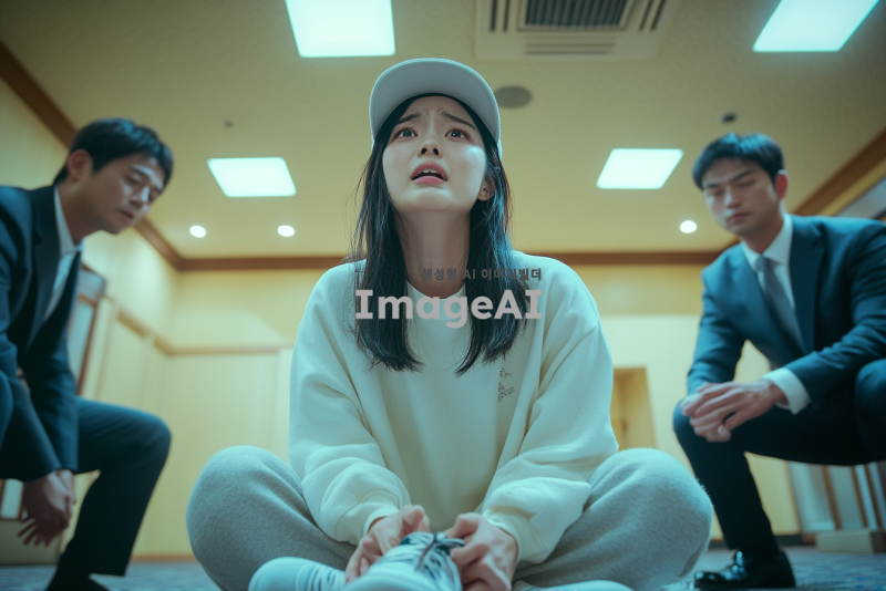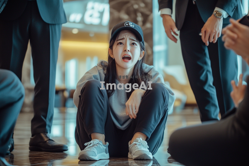 예식장 로비에 w자로 주저 앉아 흐느끼는 예쁜 한국인 여자.여자는 캡모자를 쓰고 츄리닝을 입고 슬리퍼를 신고있는데 한쪽 슬리퍼는 벗겨져있다. 정장을 입은 남자들이 이 여자를 제지하려고한다.