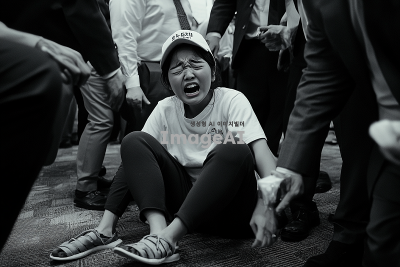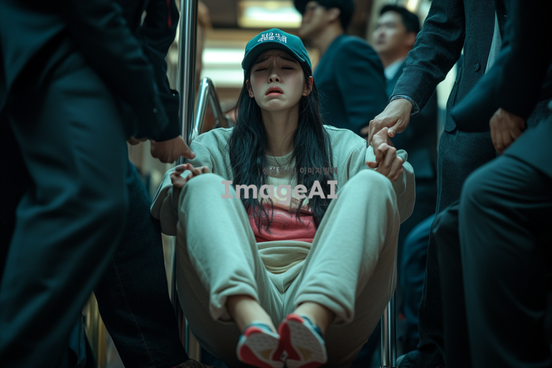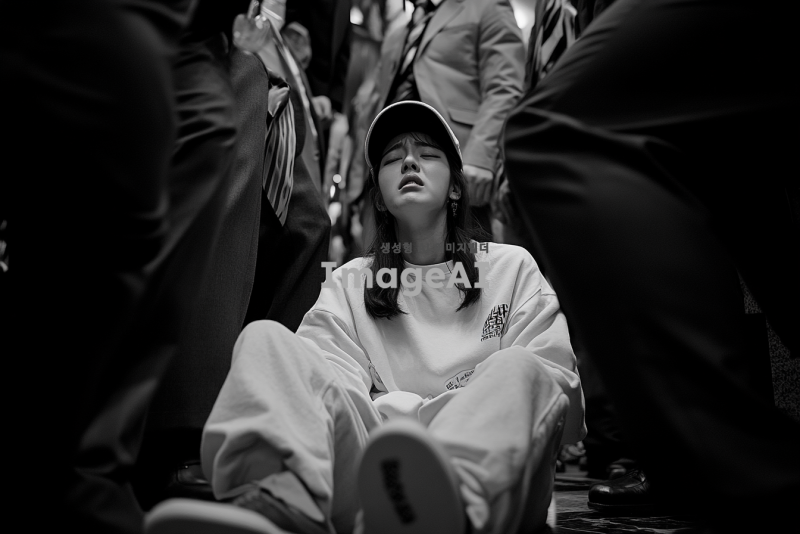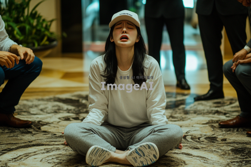 예식장 로비에 w자로 주저 앉아 흐느끼는 예쁜 한국인 여자.여자는 캡모자를 쓰고 츄리닝을 입고 쪼리를 신고있으며 한쪽 쪼리는 벗겨져있다. 정장을 입은 남자들이 이 여자를 일으켜 세우려고한다.