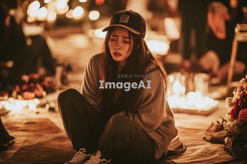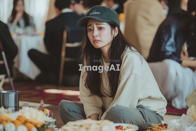 전남친의 결혼식을 목격하고 바닥에 주저앉아 엉엉 우는 모습의 예쁜 한국인 여성. 캡모자를 쓰고 츄리닝을 입고 발에 슬리퍼를 신은 채로, 슬픔에 잠긴 표정으로 눈물을 흘리고 있는 상황. 주변은 결혼식의 화려한 장식과 사람들로 가득 차 있으며, 그녀의 감정이 더욱 부각되도록 주변의 분위기와 대조를 이루는 장면.