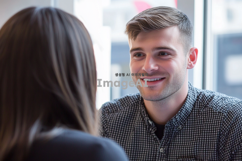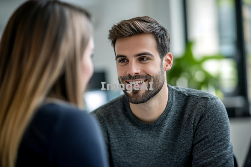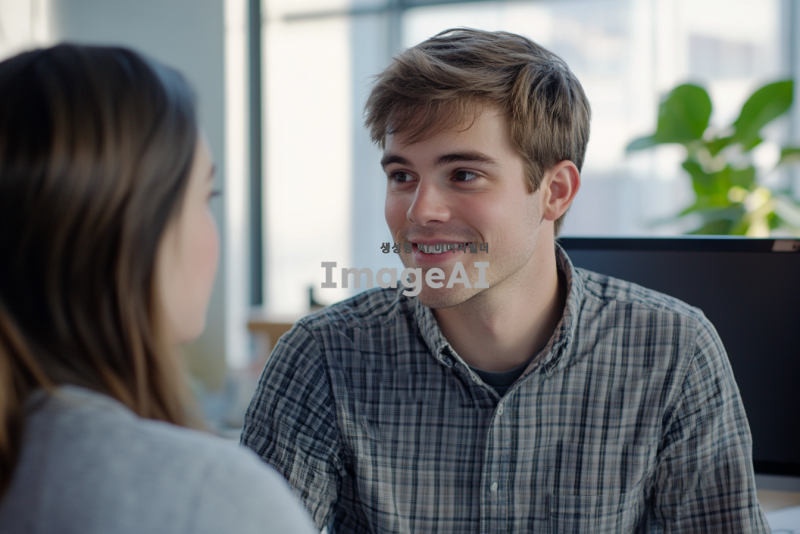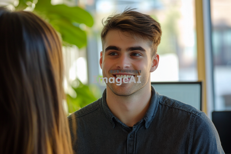 30대 초반 한국 남성이 앞머리를 내린 단정한 헤어스타일을 하고, 예쁜 여자 신입사원에게 다가가며 친근하게 대화하는 모습. 남성은 자신감 넘치는 표정으로 신입사원에게 미소를 지으며, 신입사원은 약간 놀란 듯한 표정을 지으며 그를 바라보고 있다. 배경은 사무실 환경으로, 책상과 컴퓨터가 보이고, 자연광이 들어오는 창문이 있는 모습.